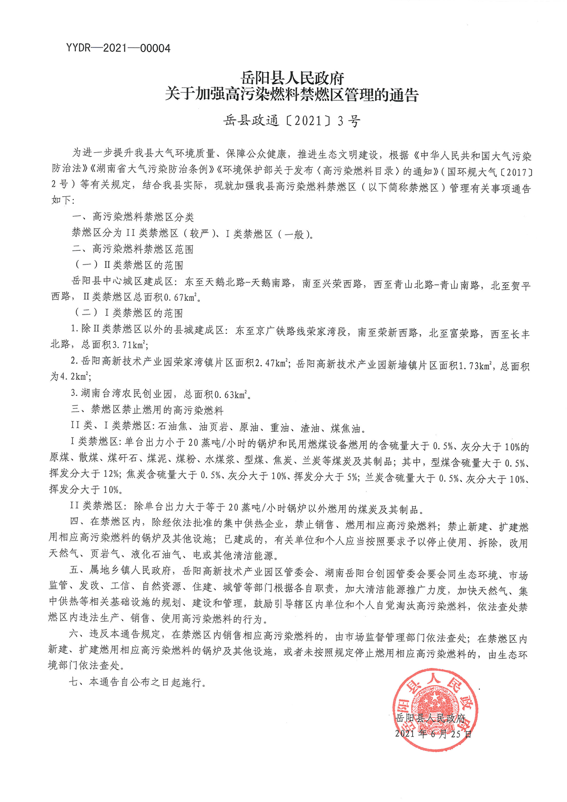 嶽陽縣人民政府關於加強高汙染燃料禁燃區管理的通告