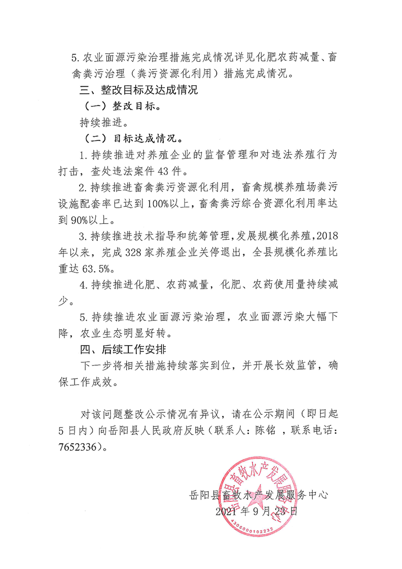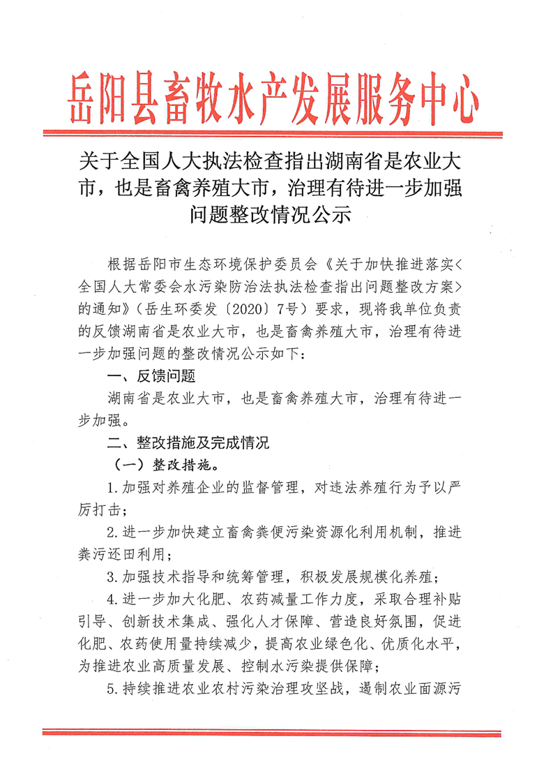 關於全國人大執法檢查指出湖南省是農業大市,也是畜禽養殖大市,治理有待進一步加強問題整改情況公示