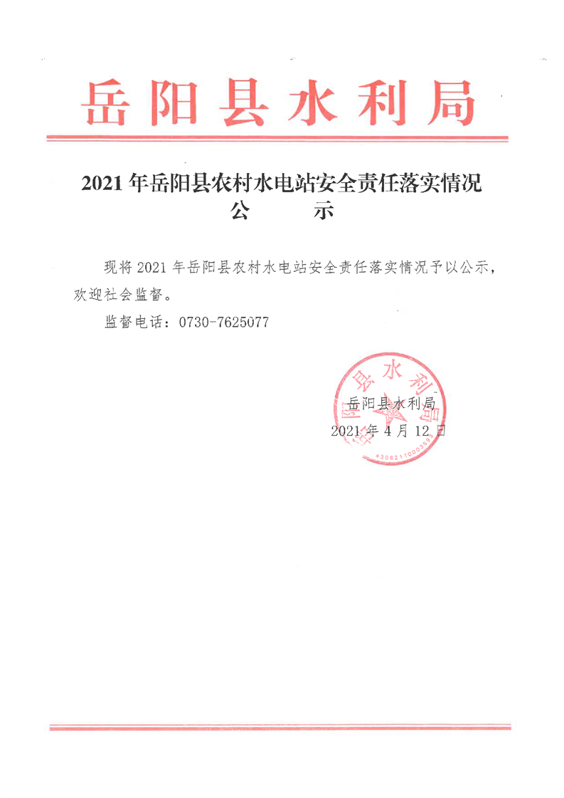 2021年嶽陽縣農村水電站安全責任落實情況公示