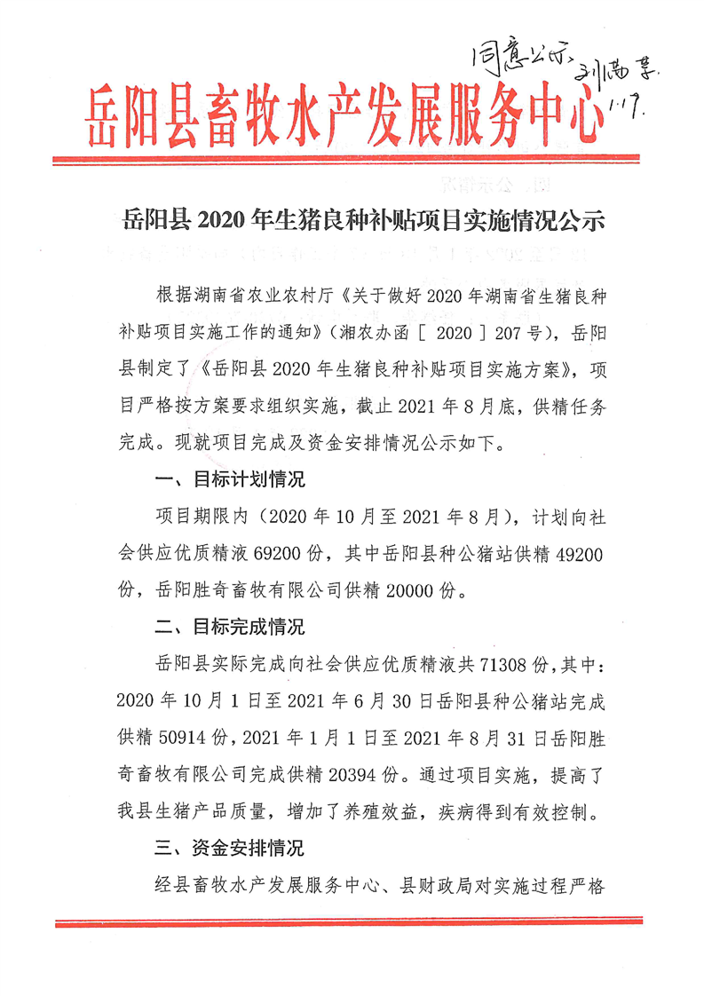 嶽陽縣2020年生豬良種補貼項目實施情況公示