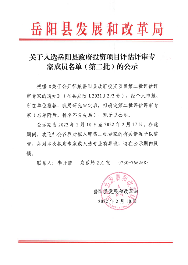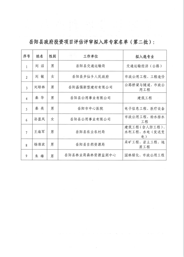 關於入選嶽陽縣政府投資項目評估評審專家成員名單(第二批)的公示