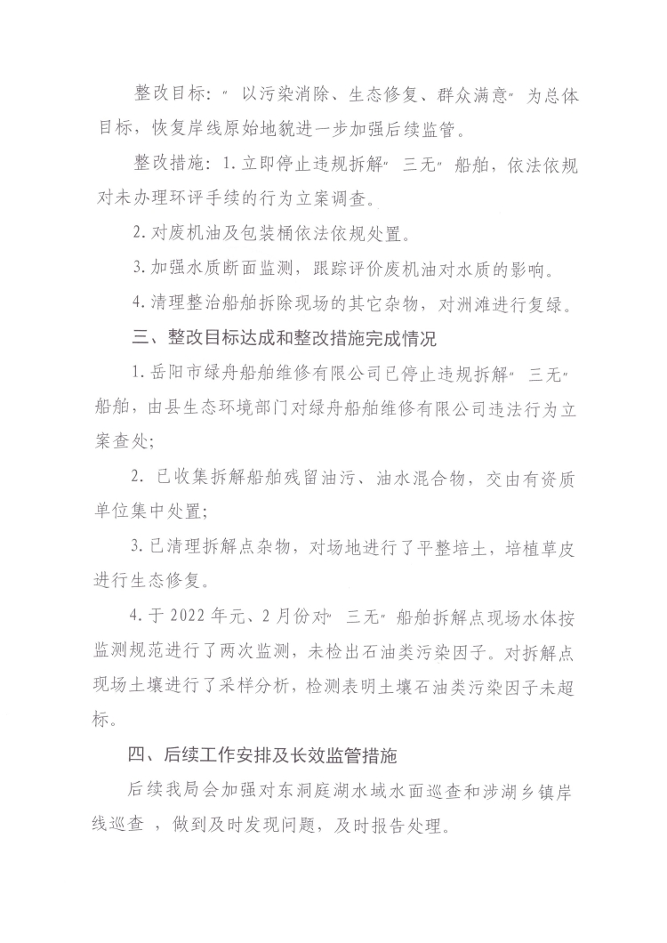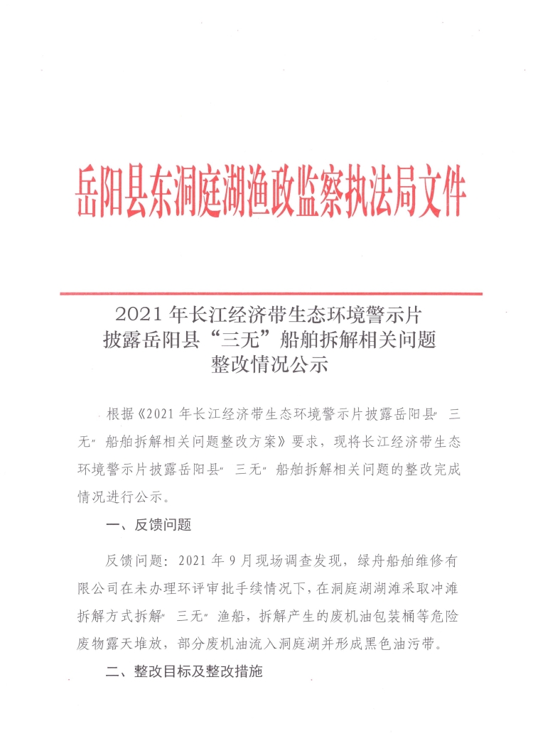 關於2021年省長江經濟帶生態環境警示片披露嶽陽縣“三無”船舶拆解相關問題整改情況公示