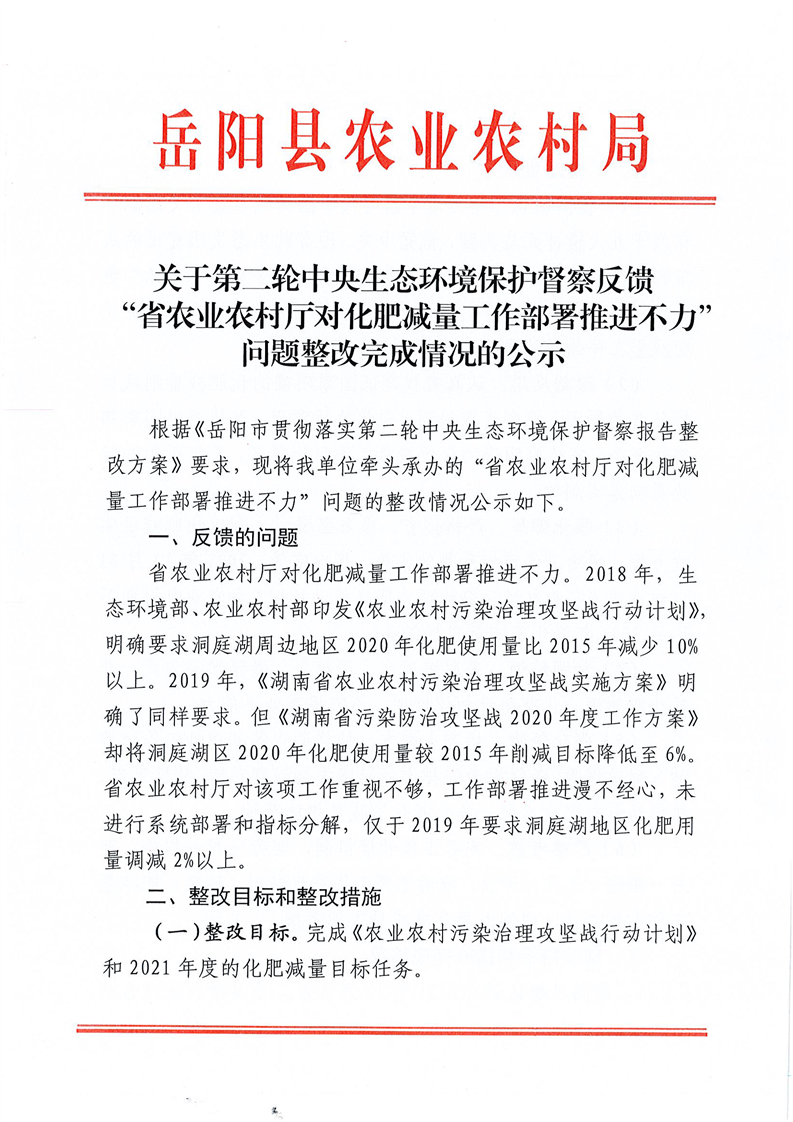 關於第二輪中央生態環境保護督查反饋“省農業農村廳對化肥減量工作部署推進不力”問題整改完成情況的公示
