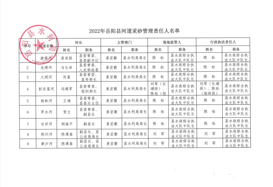 2022年嶽陽縣河道采砂管理責任人名單公示
