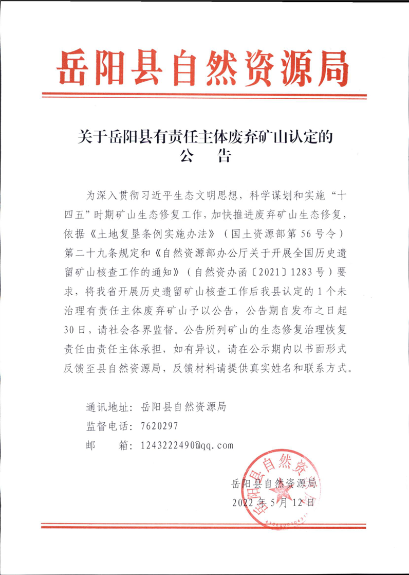 關於嶽陽縣有責任主體廢棄礦山認定的公告