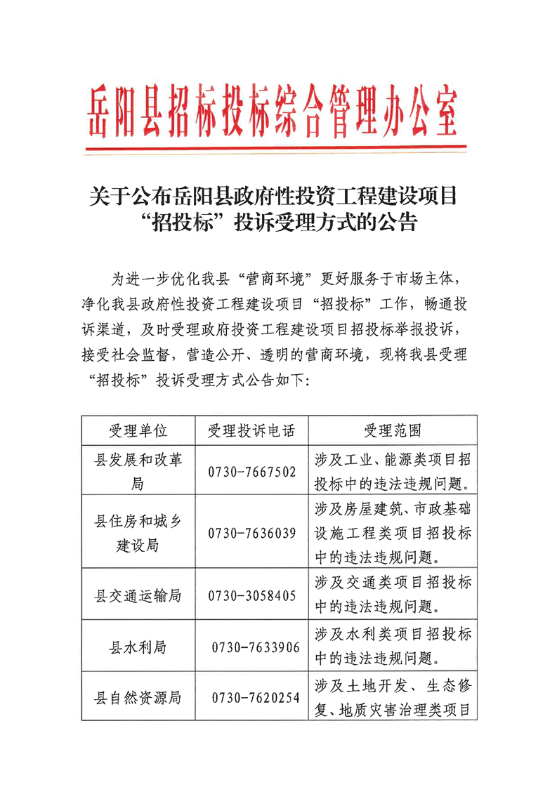 關於公布嶽陽縣政府性投資工程建設項目“招投標”投訴受理方式的公告