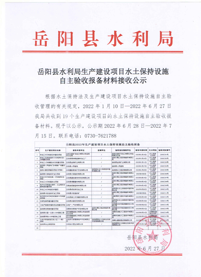嶽陽縣水利局生產建設項目水土保持設施自主驗收報備材料接收公示