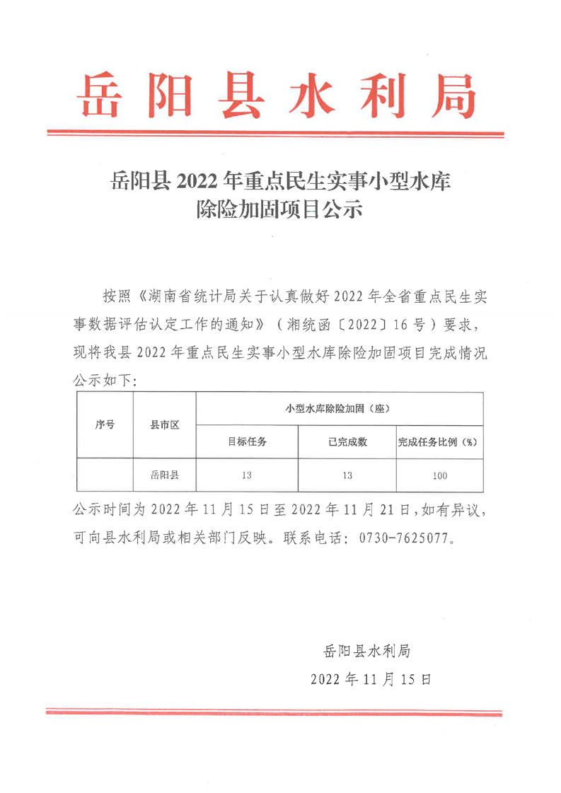 嶽陽縣2022年重點民生實事小型水庫除險加固項目公示