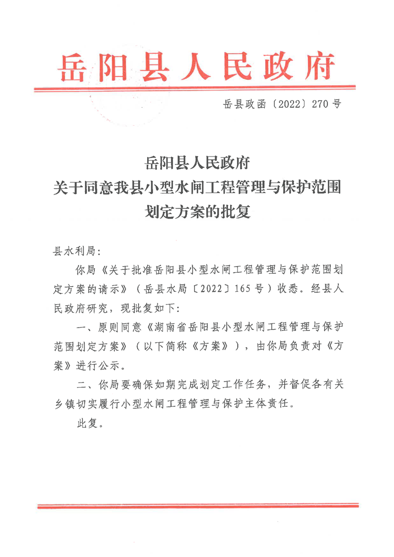 嶽陽縣人民政府關於同意我縣小型水閘工程管理與保護範圍劃定方案的批複(嶽縣政函[2022]270號)