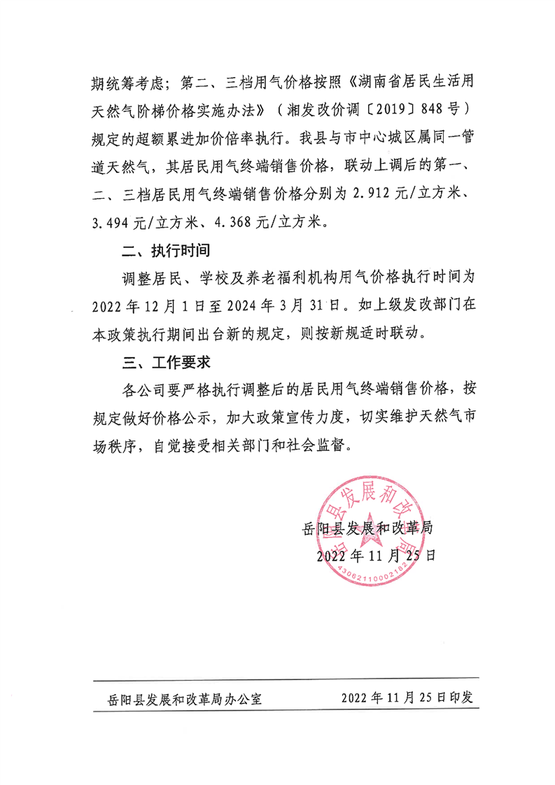 關於聯動調整我縣2022年度居民用氣終端銷售價格的通知