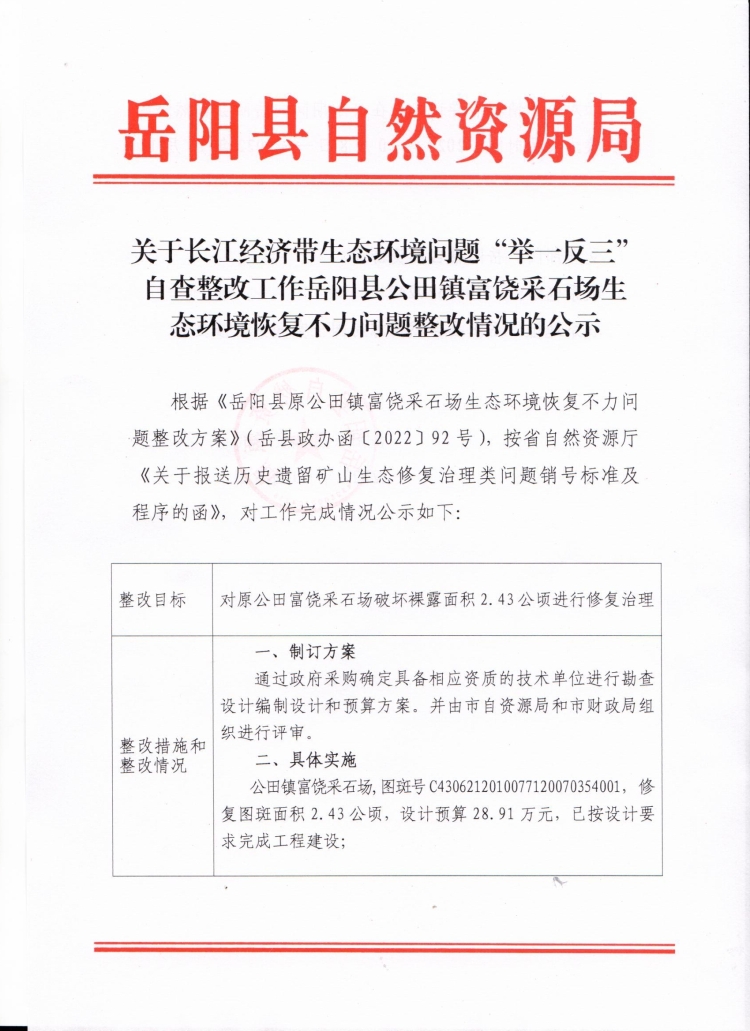 關於長江經濟帶生態環境問題“舉一反三”自查整改工作嶽陽縣公田鎮富饒采石場生態環境恢複不力問題整改情況的公示