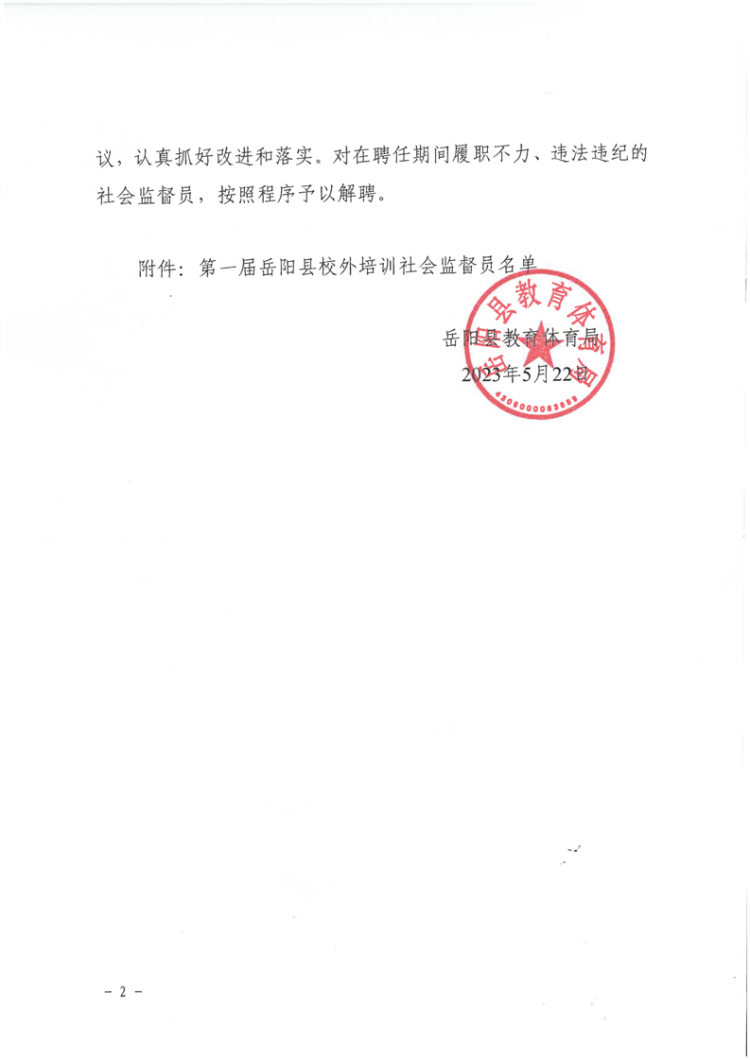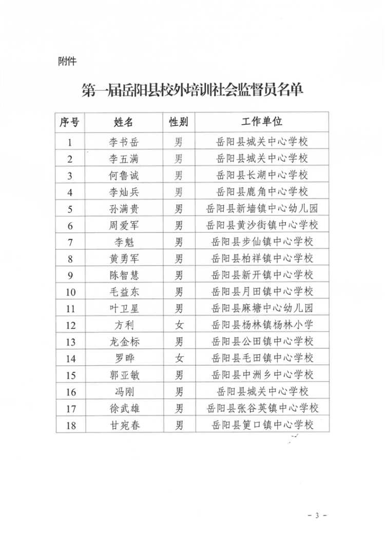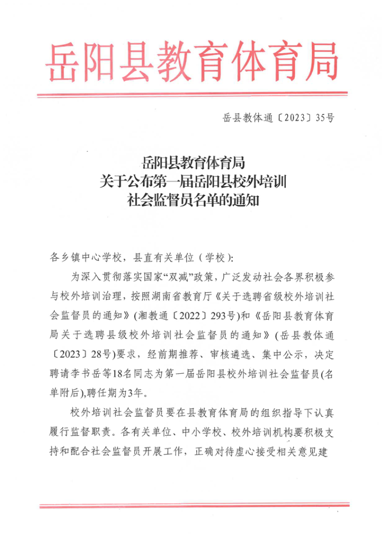 嶽陽縣教育體育局關於公布第一屆嶽陽縣校外培訓社會監督員名單的通知