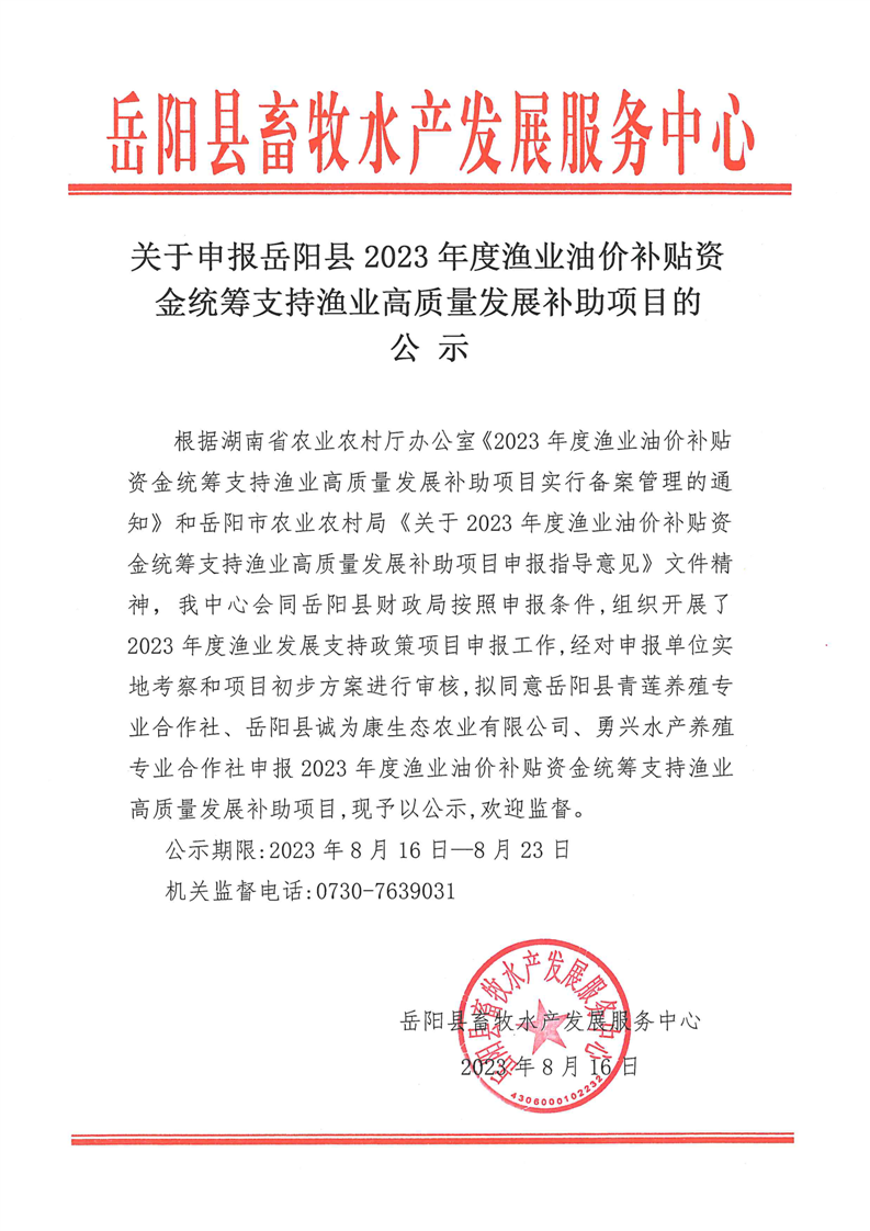 關於申報嶽陽縣2023年度漁業油價補貼資金統籌支持漁業高質量發展補助項目的公示