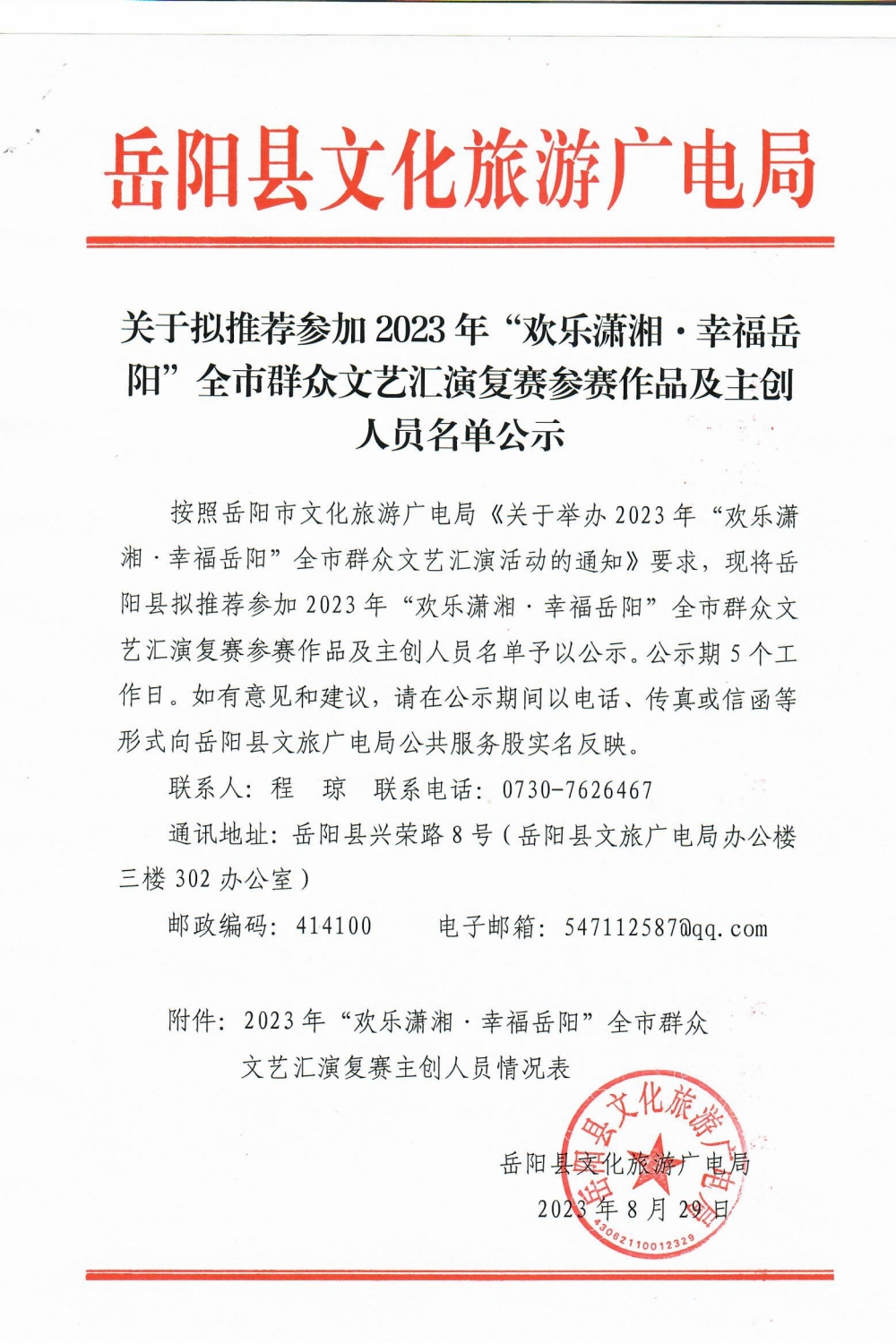關於擬推薦參加2023年“歡樂瀟湘·幸福嶽陽”全市群眾文藝匯演複賽參賽作品及主創人員名單公示