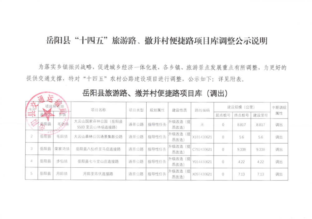 嶽陽縣“十四五”旅遊路、撤並村便捷路項目庫調整公示說明