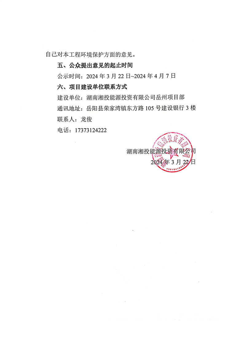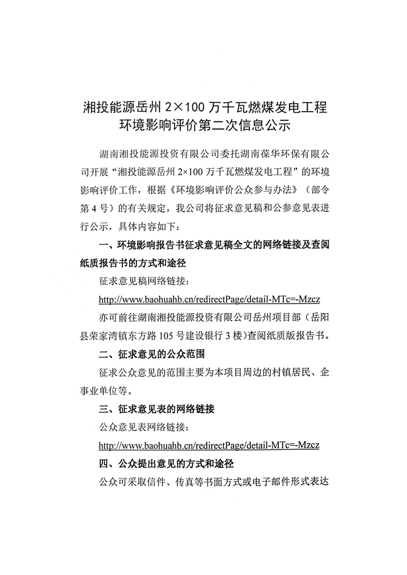 湘投能源嶽州2×100萬千瓦燃煤發電工程環評第二次信息公示
