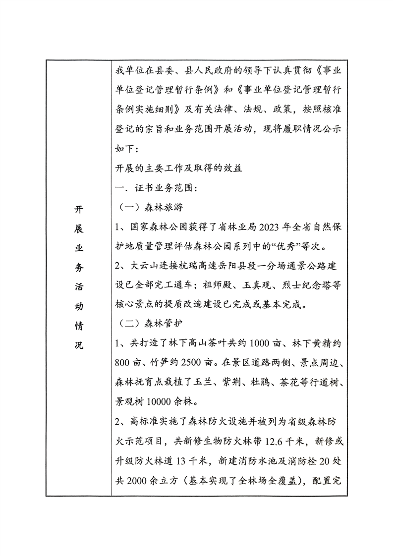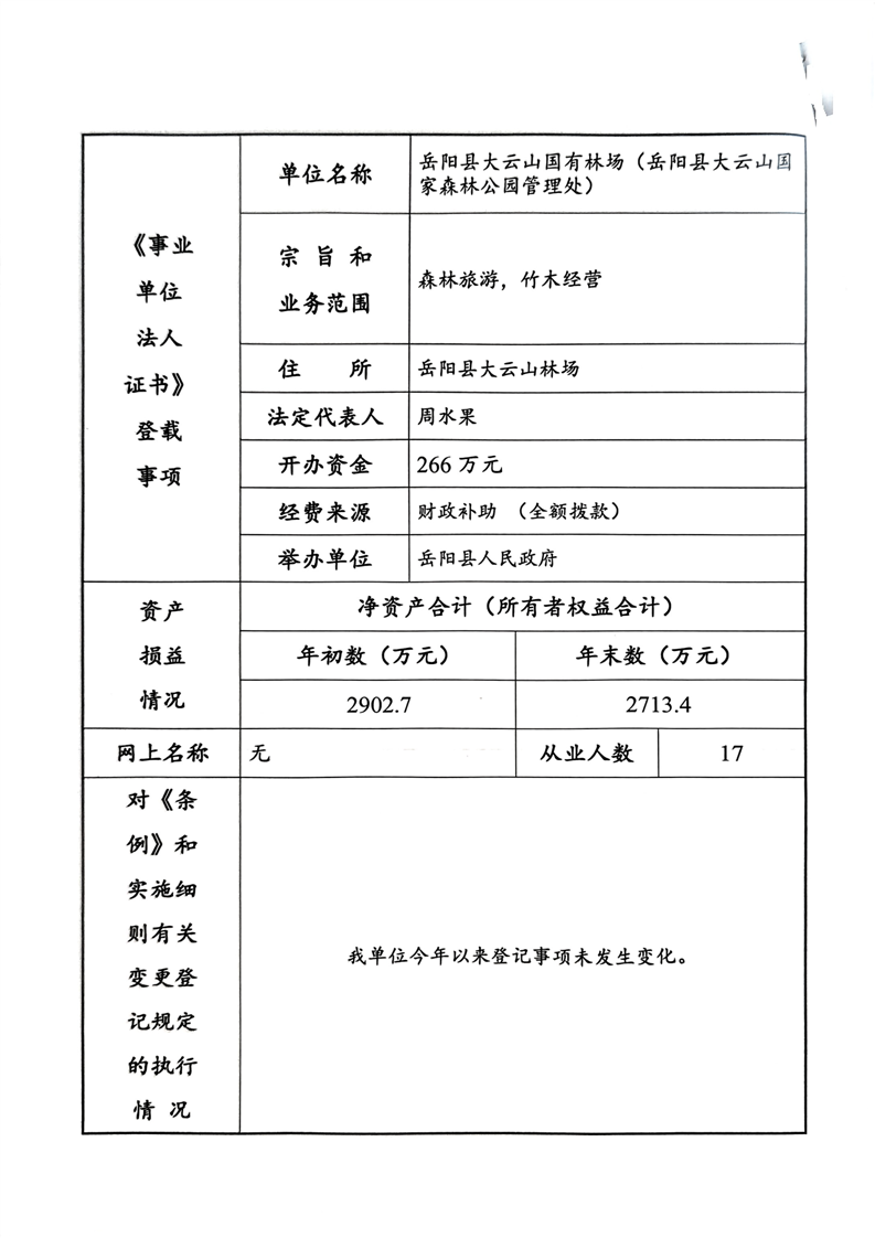 嶽陽縣大雲山國家森林公園管理處2023年事業單位法人年度報告書
