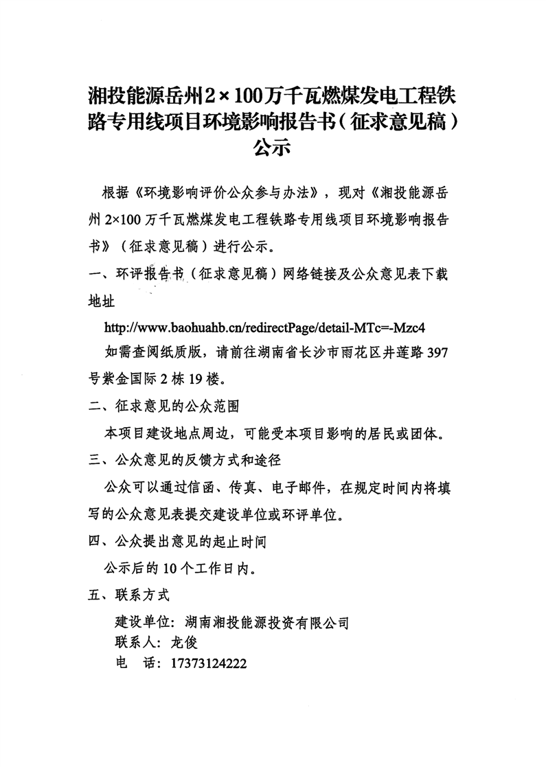 湘投能源嶽州2×100萬千瓦燃煤發電工程鐵路專用線項目環境影響報告書(征求意見稿)