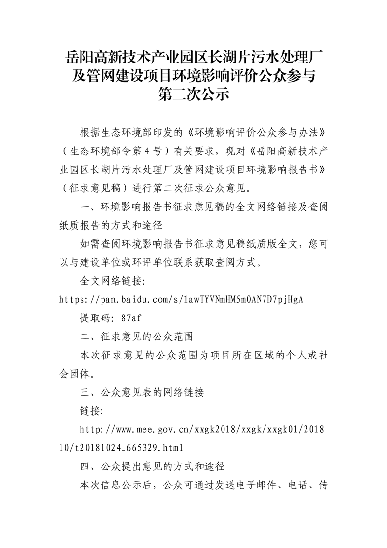 嶽陽高新技術產業園區長湖片汙水處理廠及管網建設項目環境影響評價公眾參與第二次公示