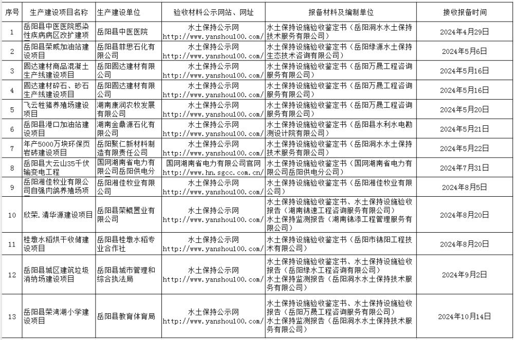 嶽陽縣水利局2024年生產建設項目水土保持設施自主驗收報備材料接收公示