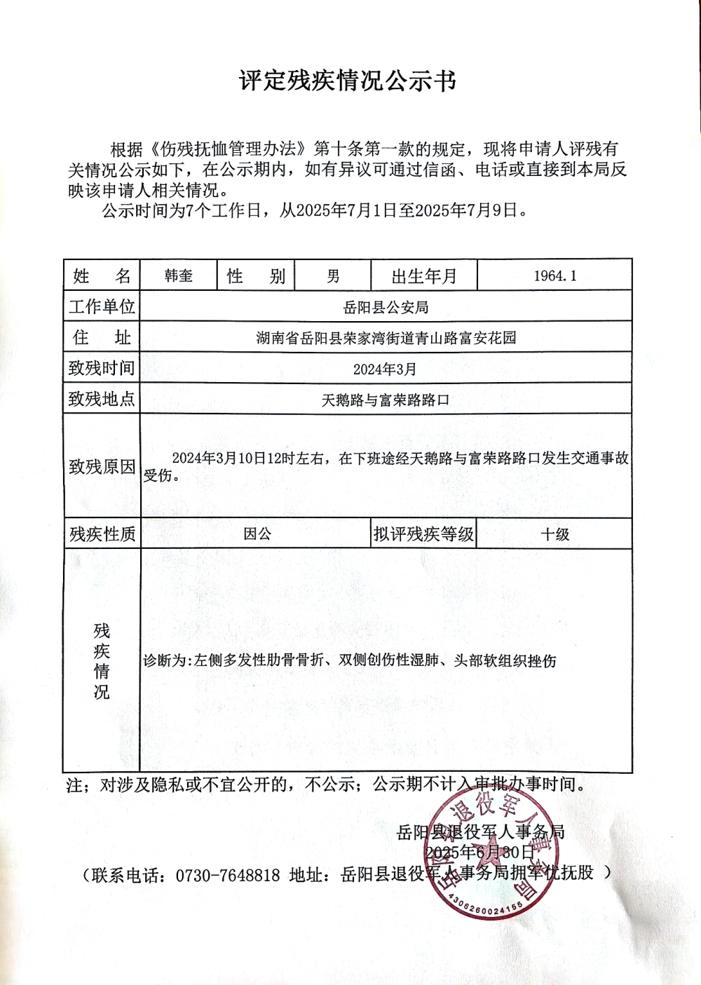 嶽陽縣退役軍人事務局評定殘疾情況公示書(韓奎)