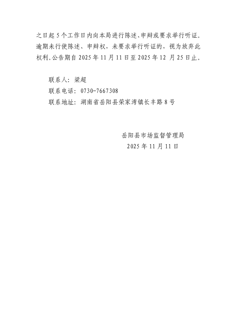 嶽陽縣市場監督管理局撤銷行政許可意見告知書