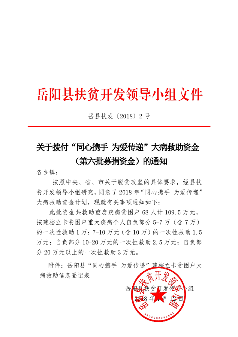 嶽縣扶發【2018】2號——關於撥付“同心攜手 為愛傳遞”大病救助資金(第六批募捐資金)的通知