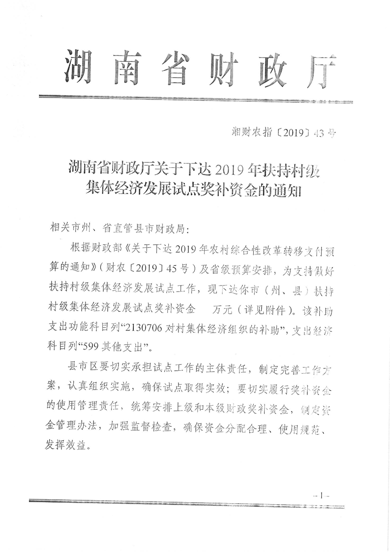 2019年扶持村級集體經濟發展試點中央和省級獎補資金公開