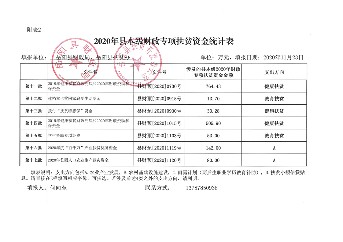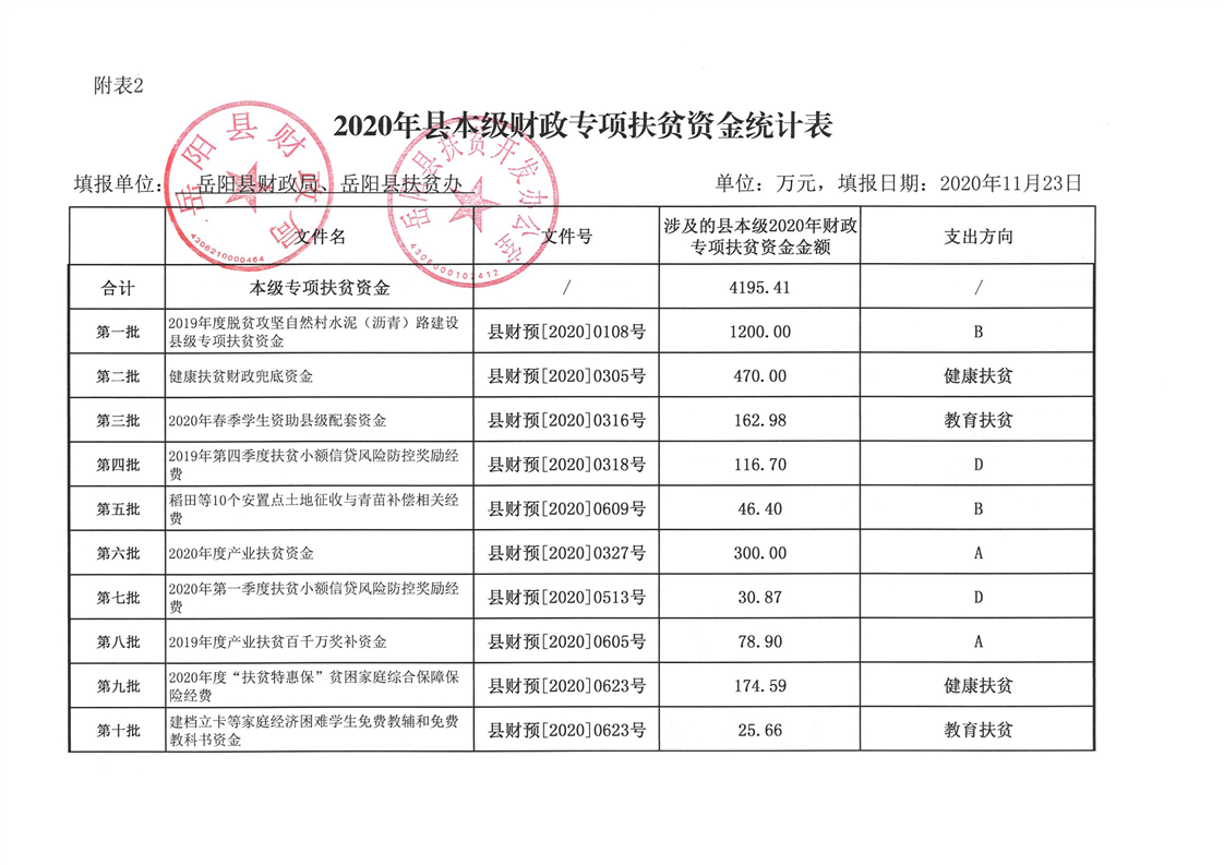 2020年度嶽陽縣財政局本級專項扶貧資金台賬