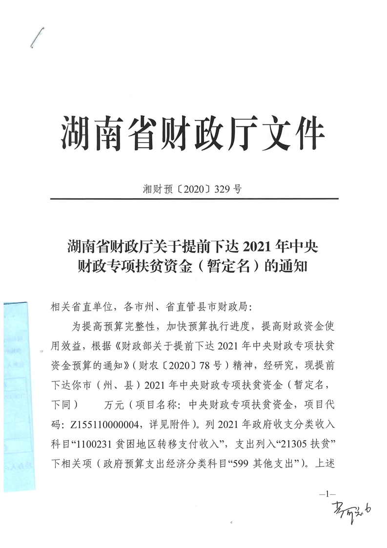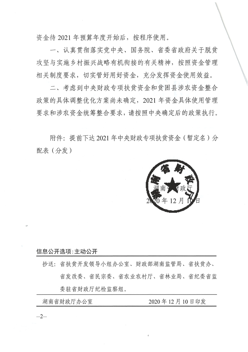 湖南省財政廳提前下達2021年中央財政專項扶貧資金(暫定名)公開公示