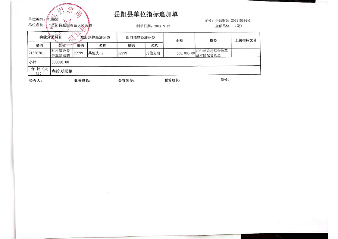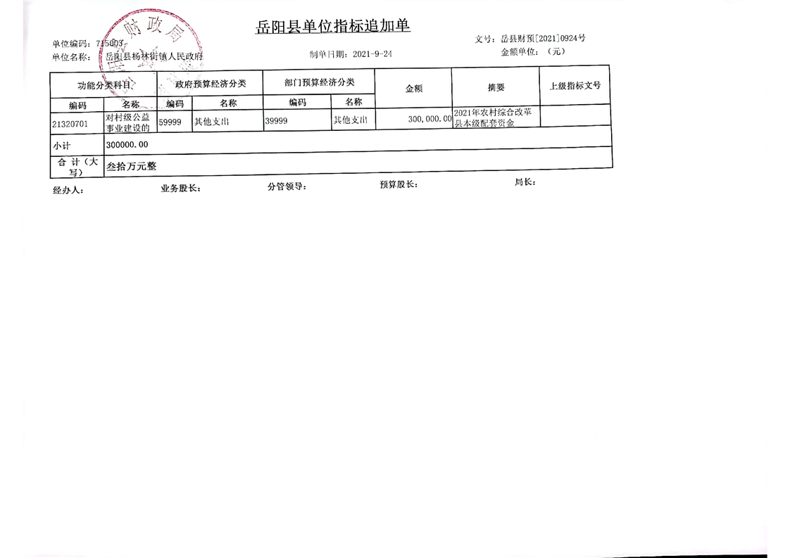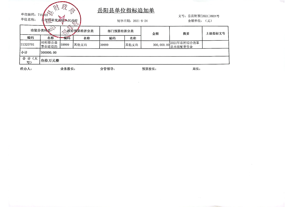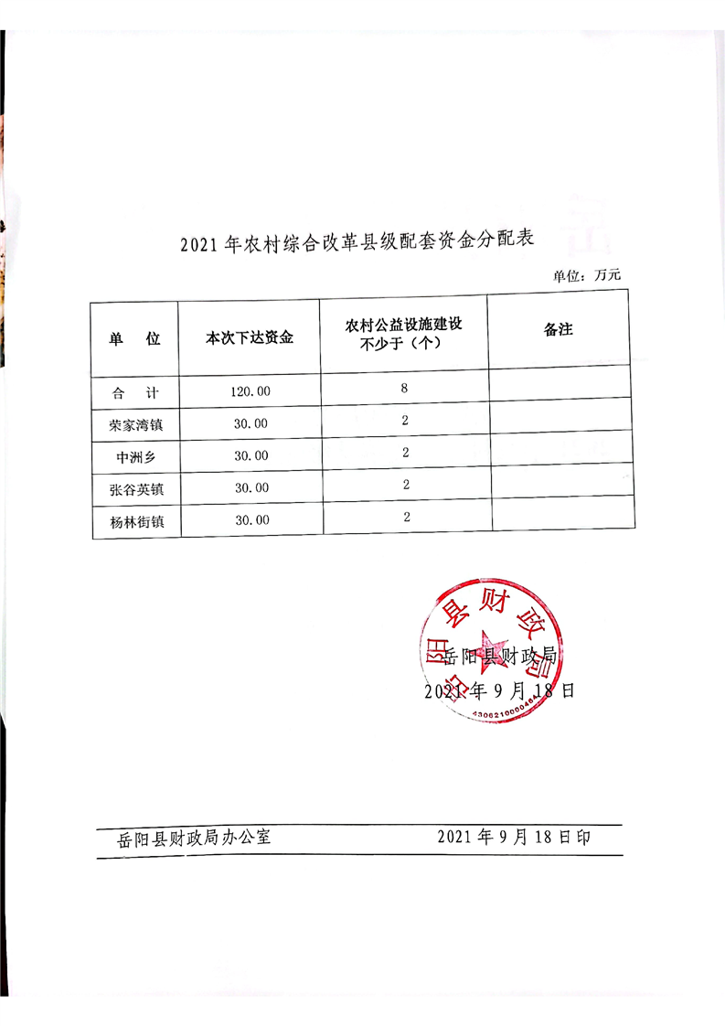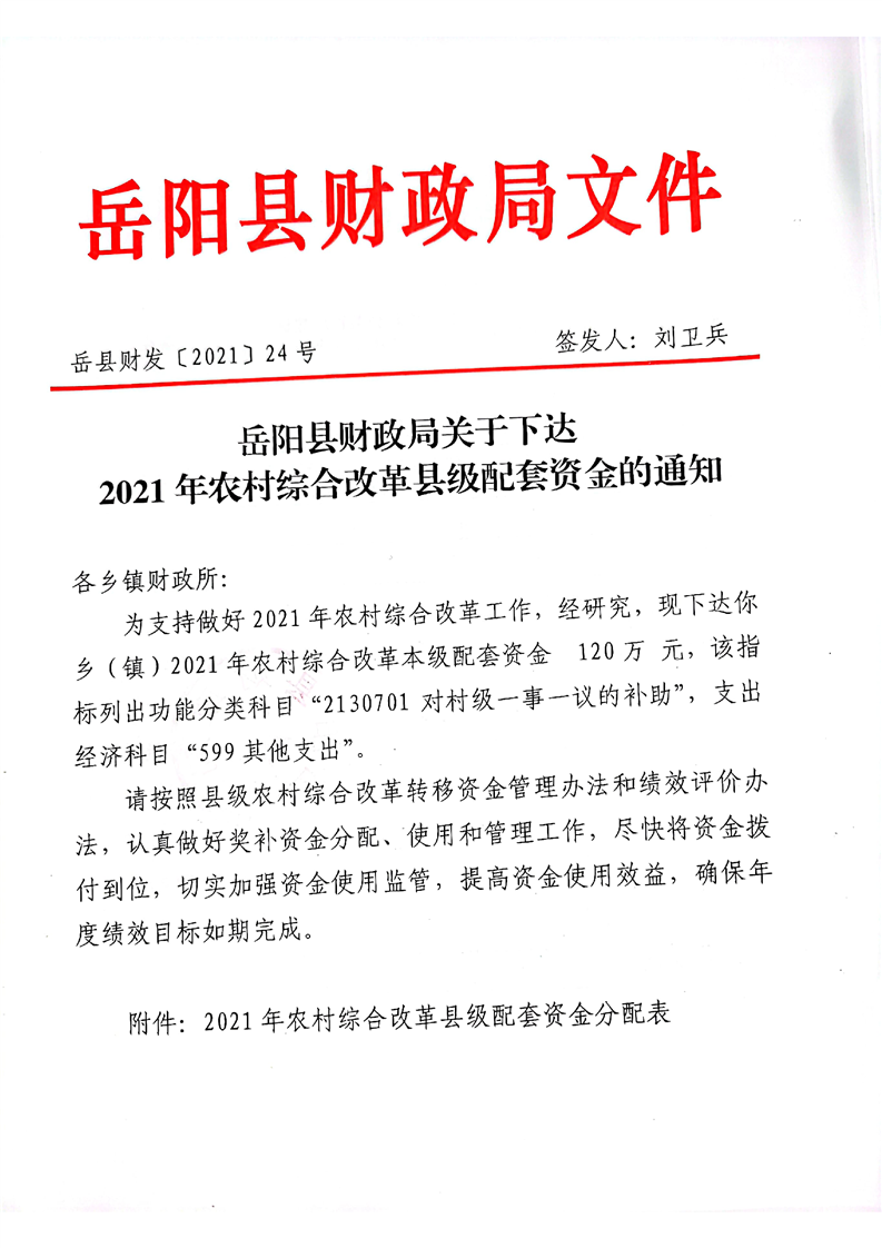嶽陽縣財政局關於下達2021年農村綜合改革縣級配套資金的通知 嶽縣財發[2021]24號 120萬