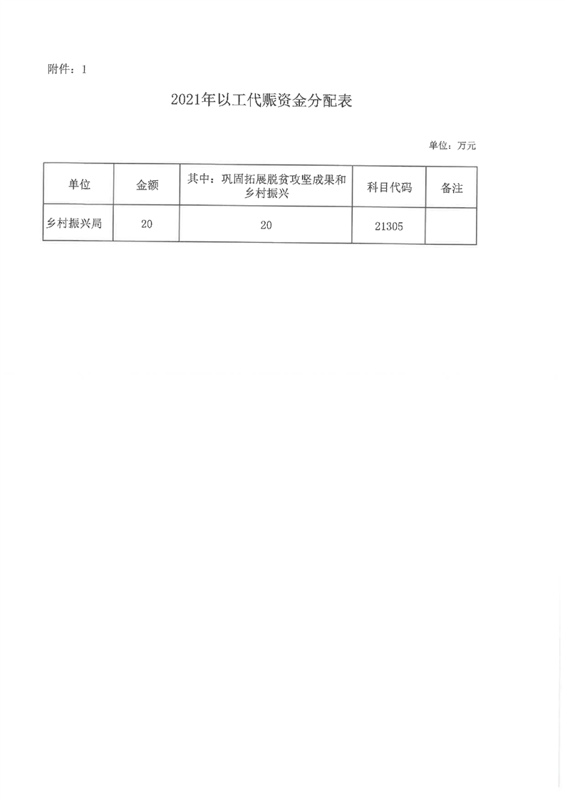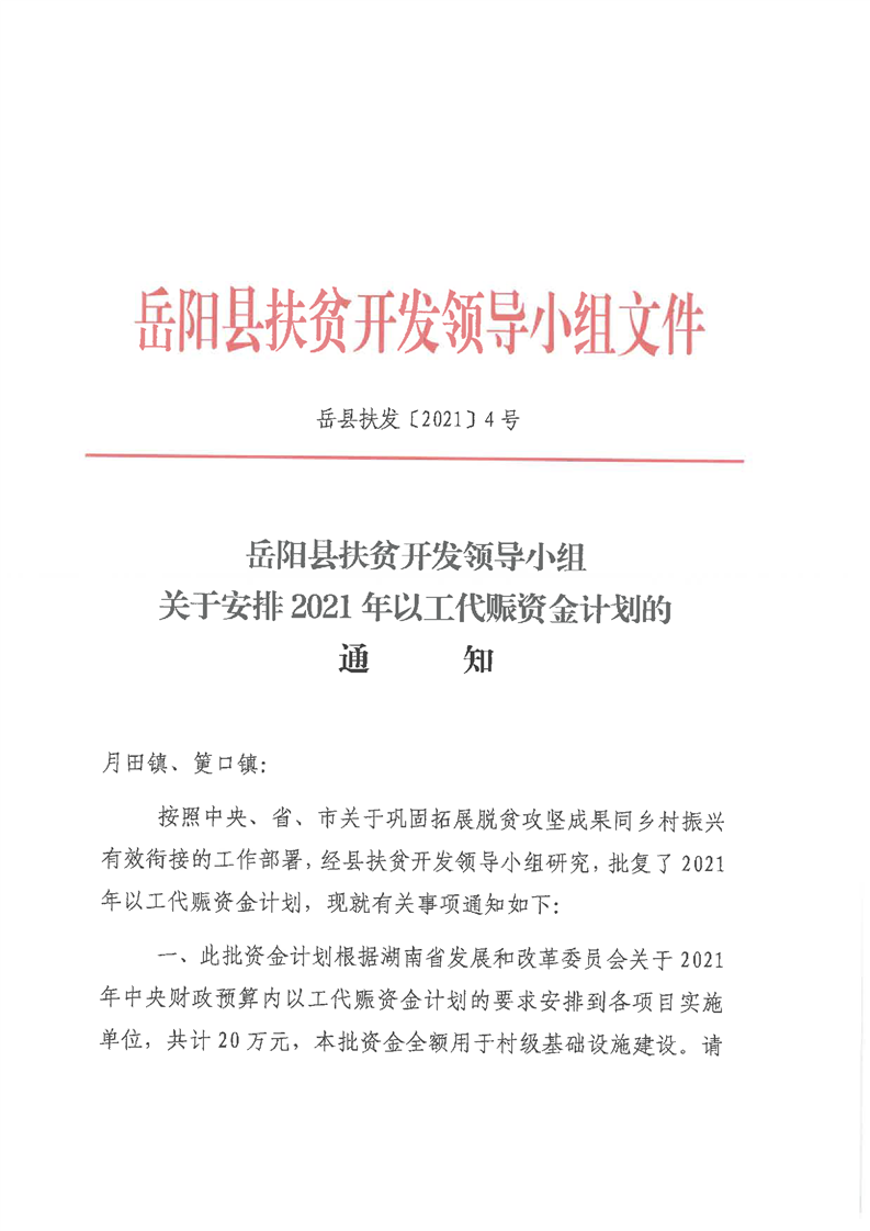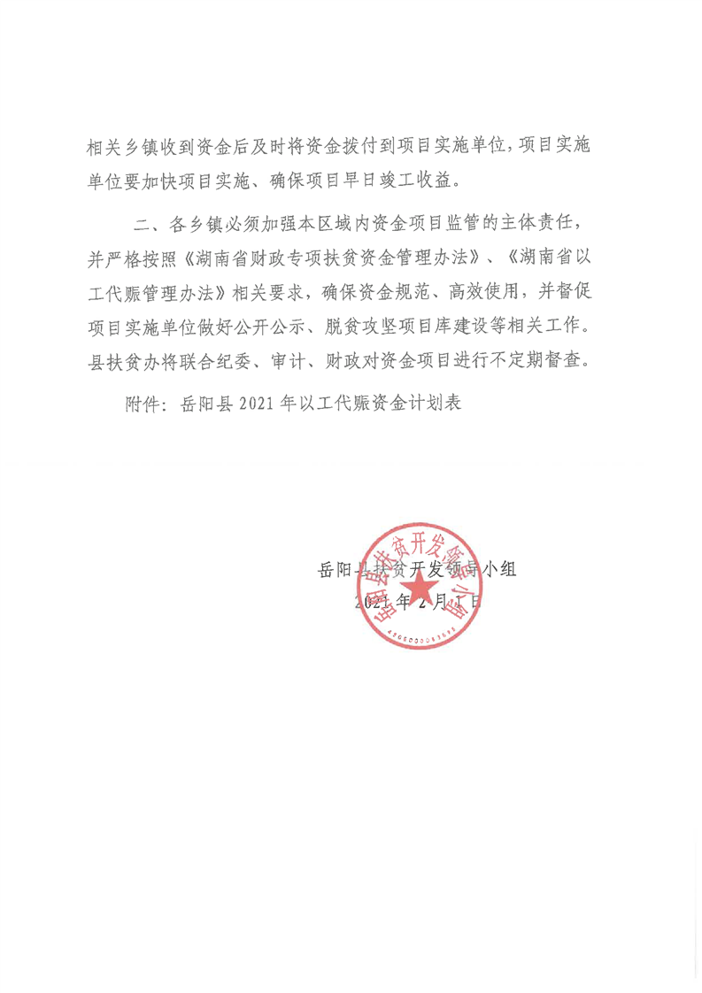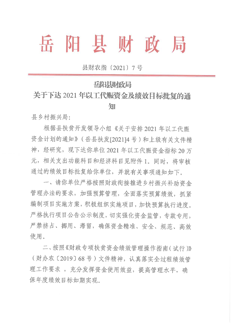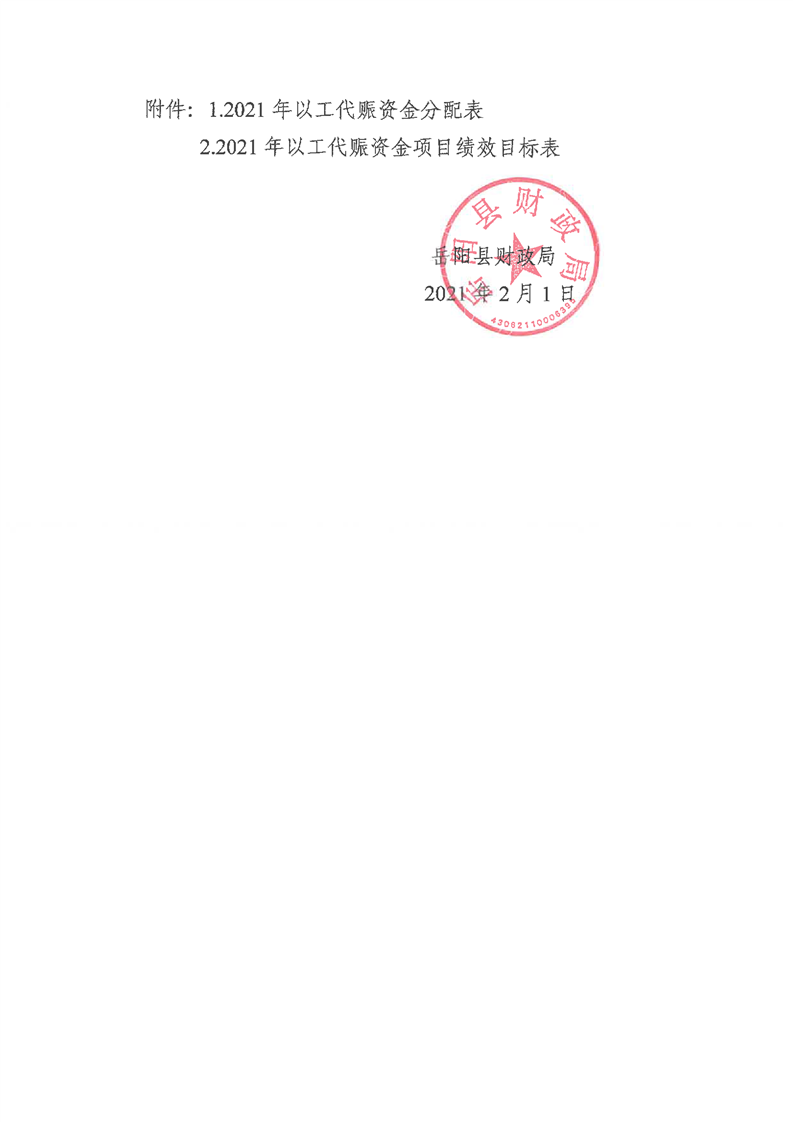 嶽陽縣財政局2021年關於下達以工代賑資金及績效目標批複公開公示