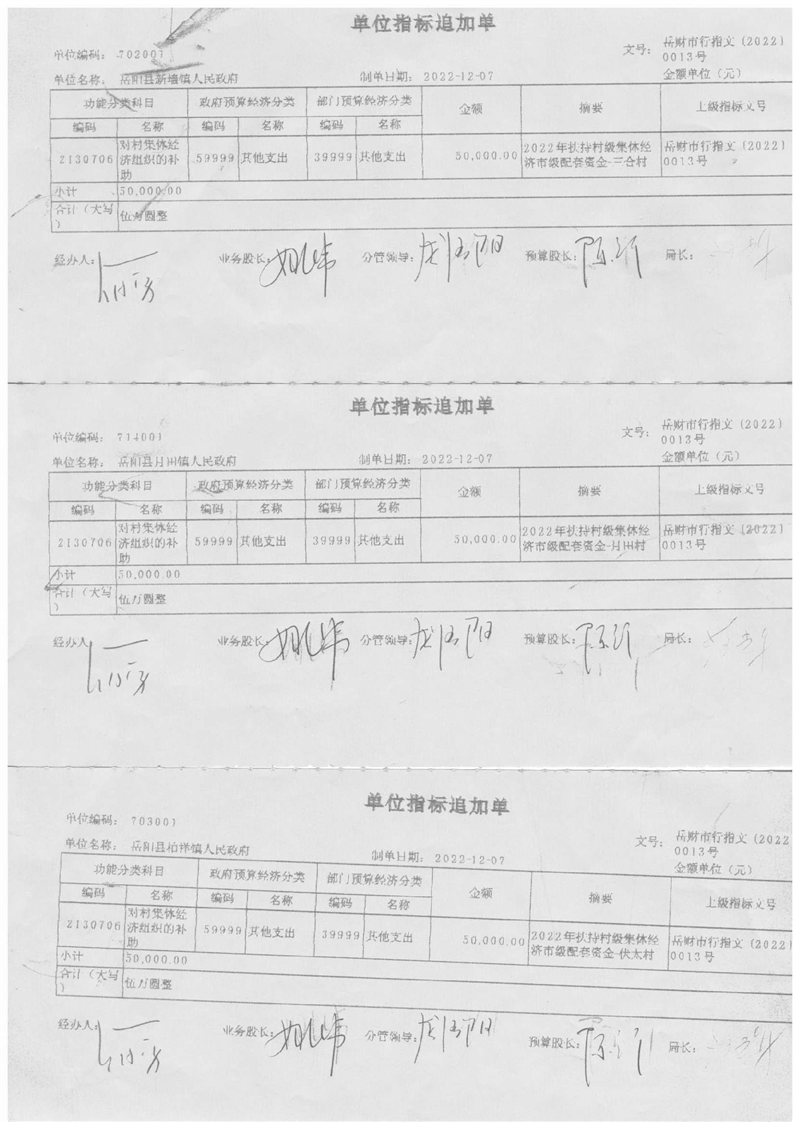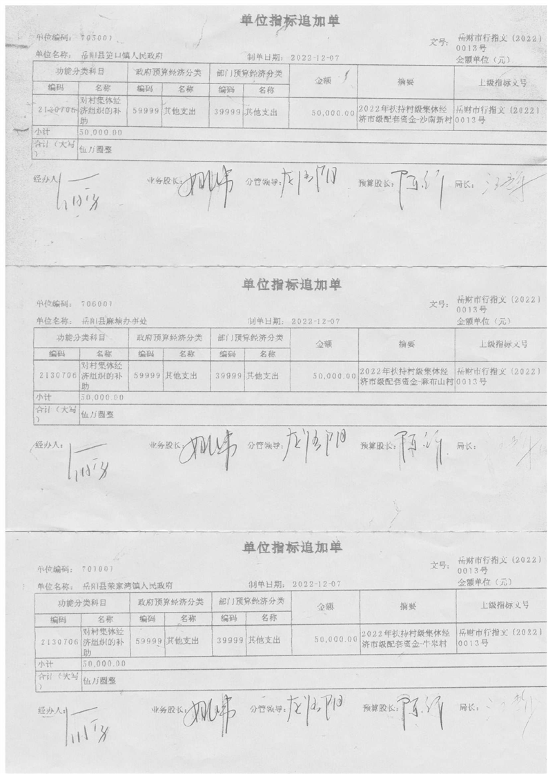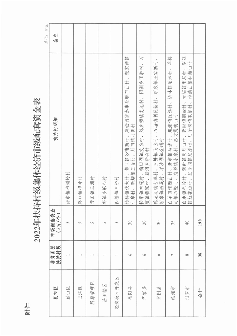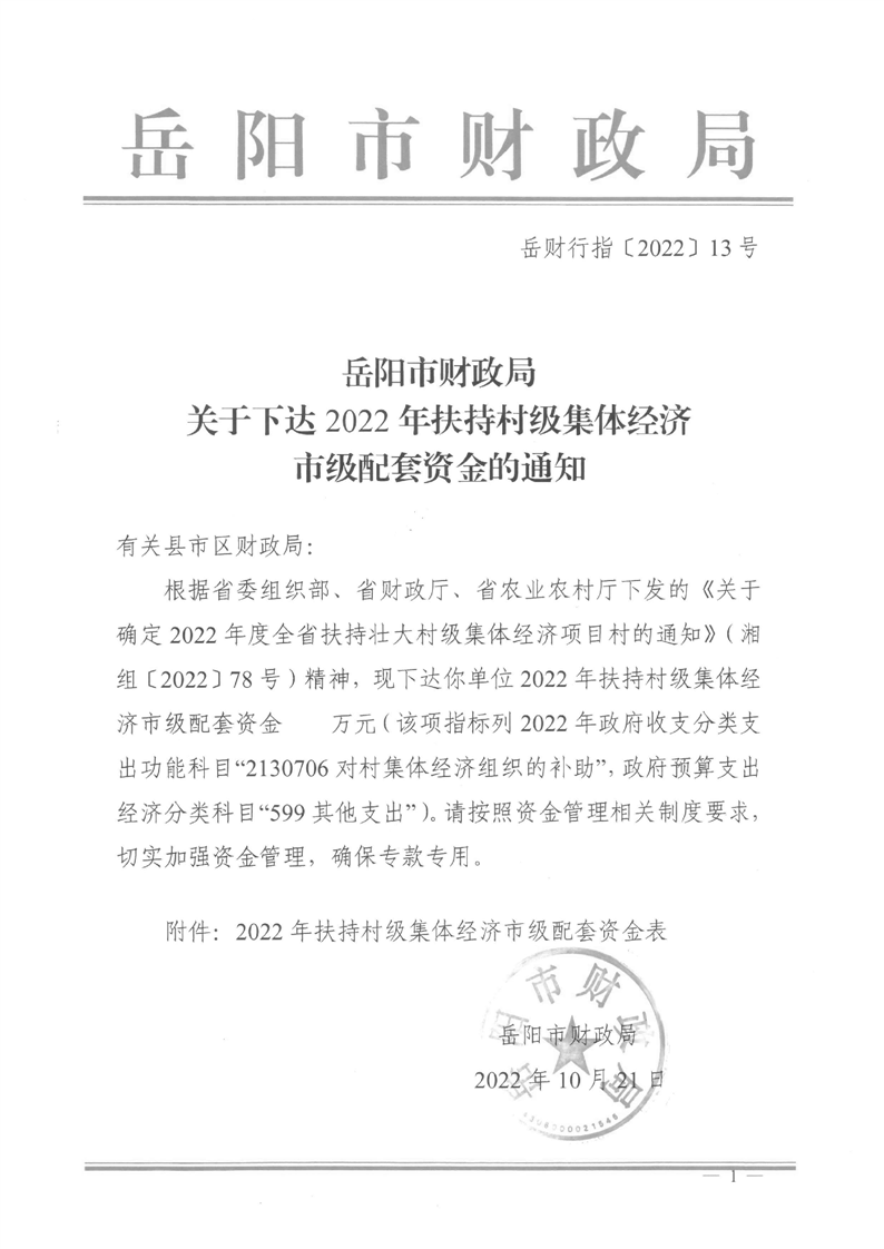 嶽陽市財政局關於下達2022年扶持村級集體經濟市級配套資金的通知(嶽財行指〔2022〕13號)及撥付單