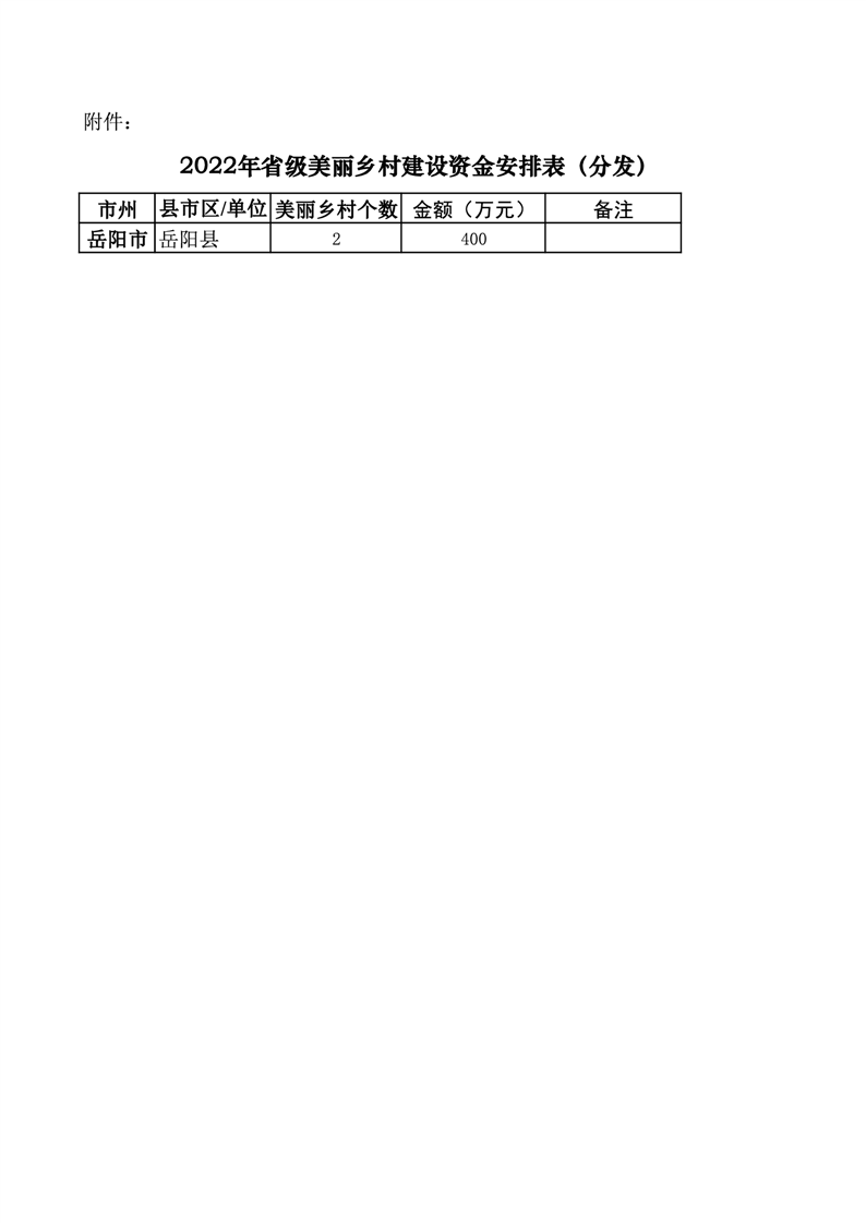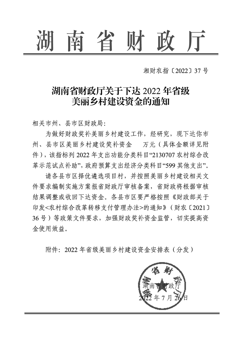 17、湖南省財政廳關於下達2022年省級美麗鄉村建設資金的通知(湘財農指〔2022〕37號)及資金安排