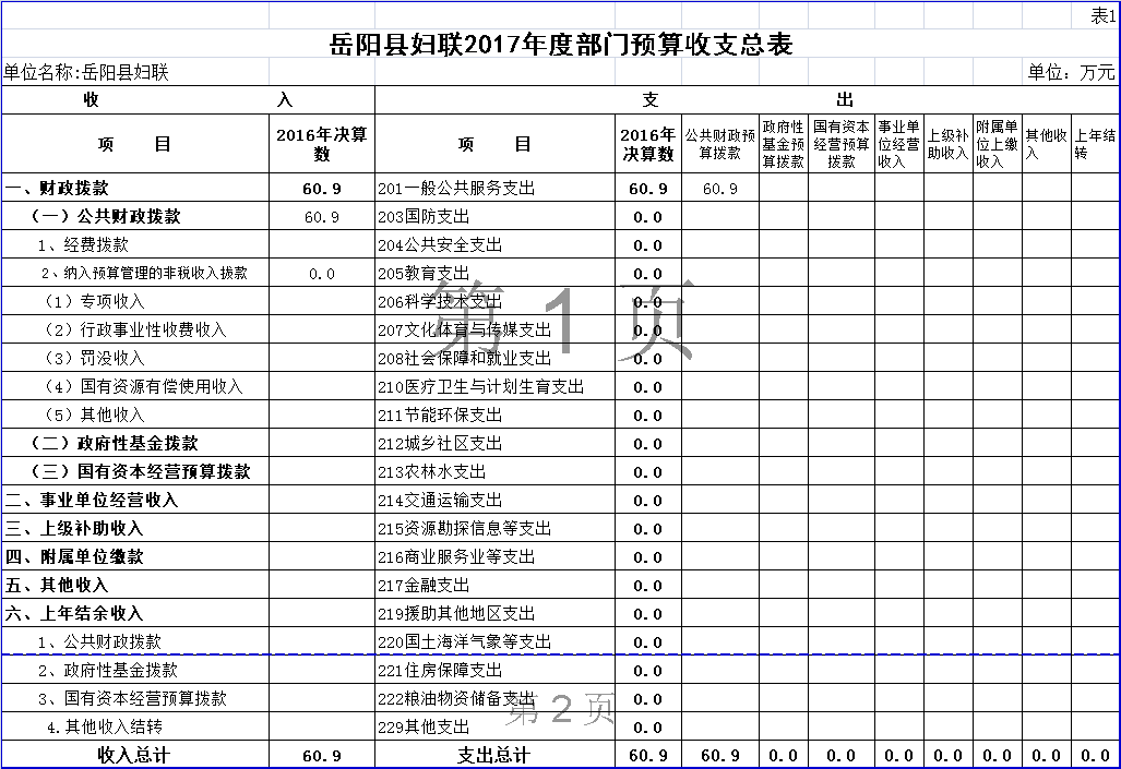 嶽陽縣婦聯2017年度部門預算收支總表