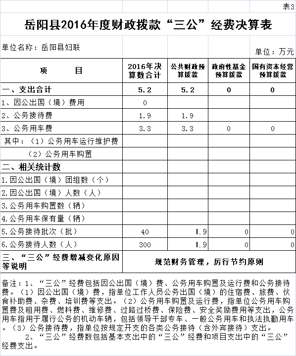 嶽陽縣2016年度財政撥款“三公”經費決算表