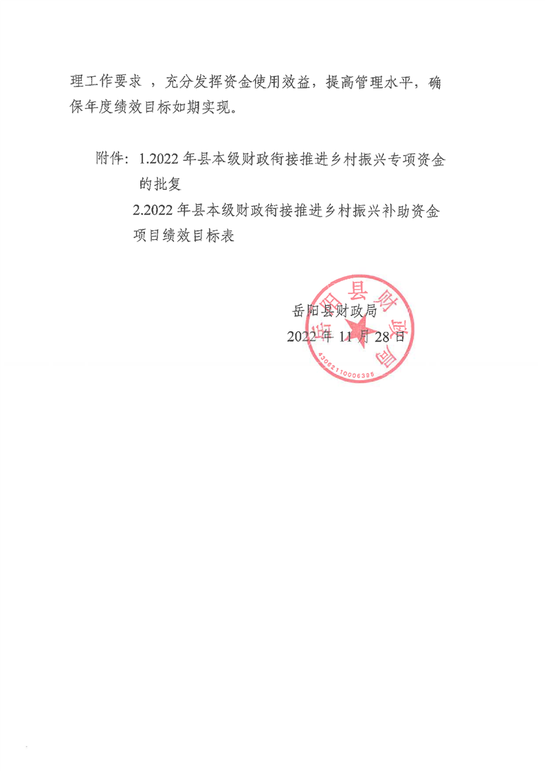 嶽陽縣財政局關於下達2022年縣本級財政銜接推進鄉村振興補助資金及績效目標批複(城管局56.02)公開公示