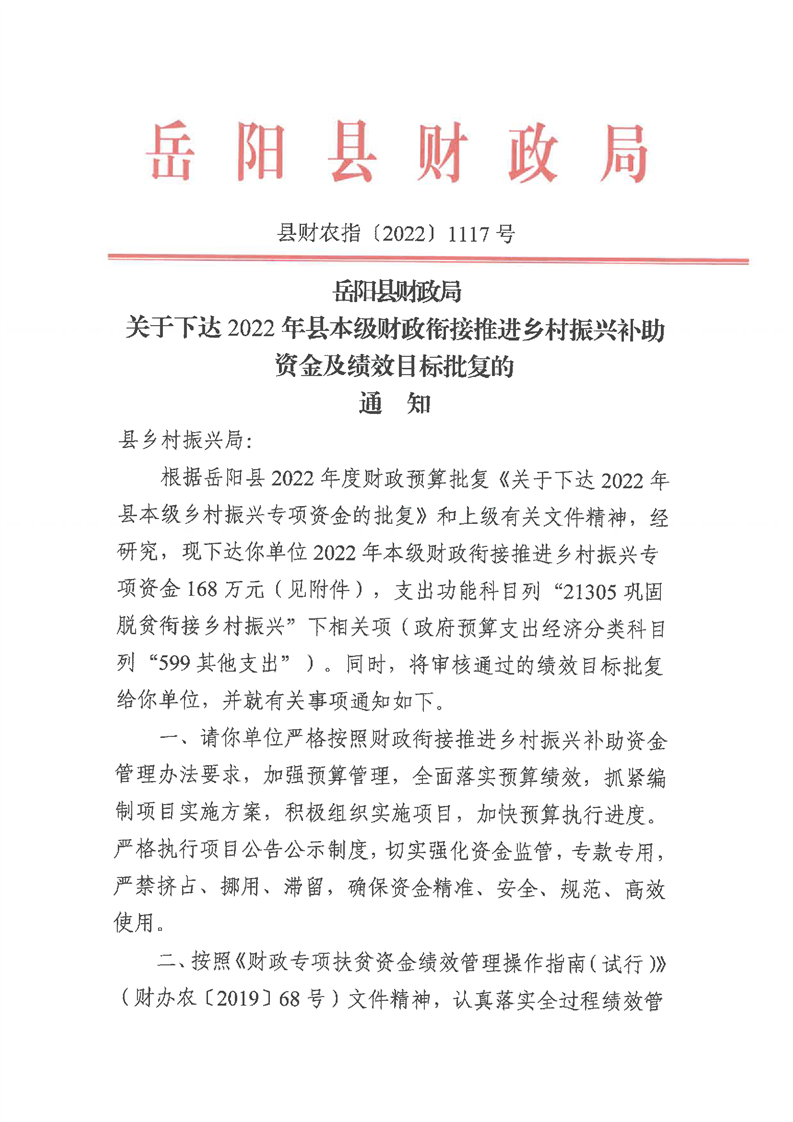 嶽陽縣財政局關於下達2022年縣本級財政銜接推進鄉村振興補助資金及績效目標批複(鄉村振興局168)公開公示