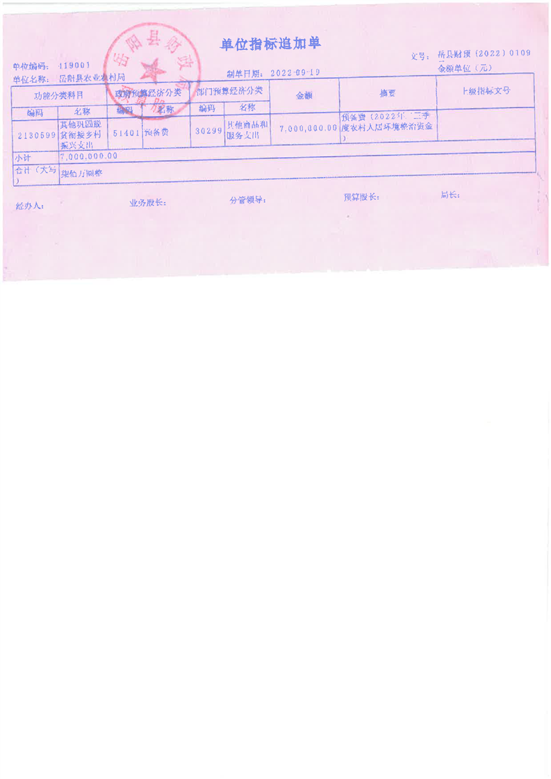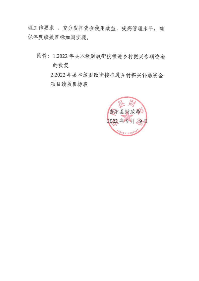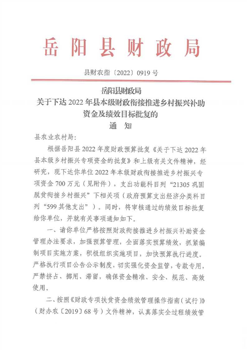 嶽陽縣財政局關於下達2022年縣本級財政銜接推進鄉村振興補助資金及績效目標批複(農業局700)公開公示