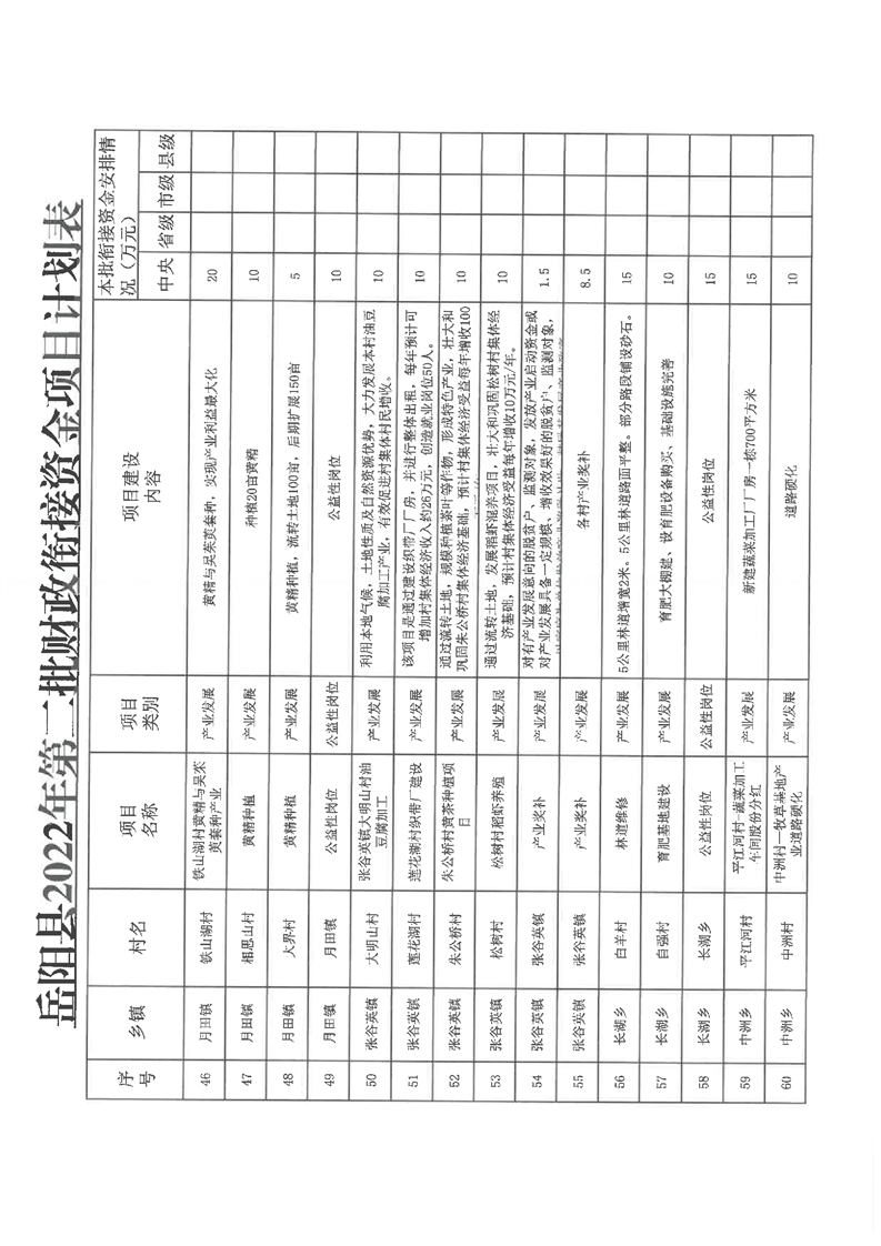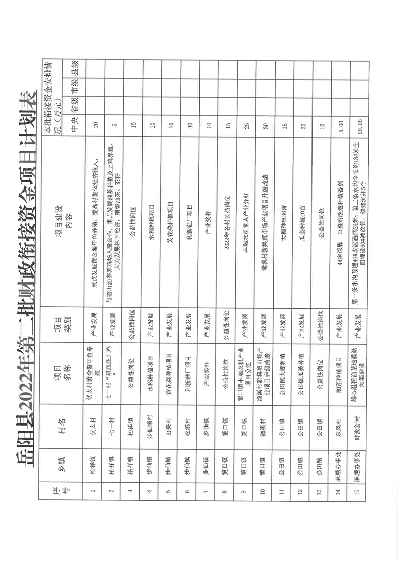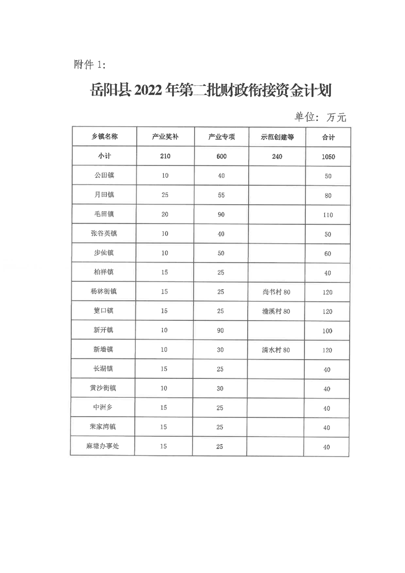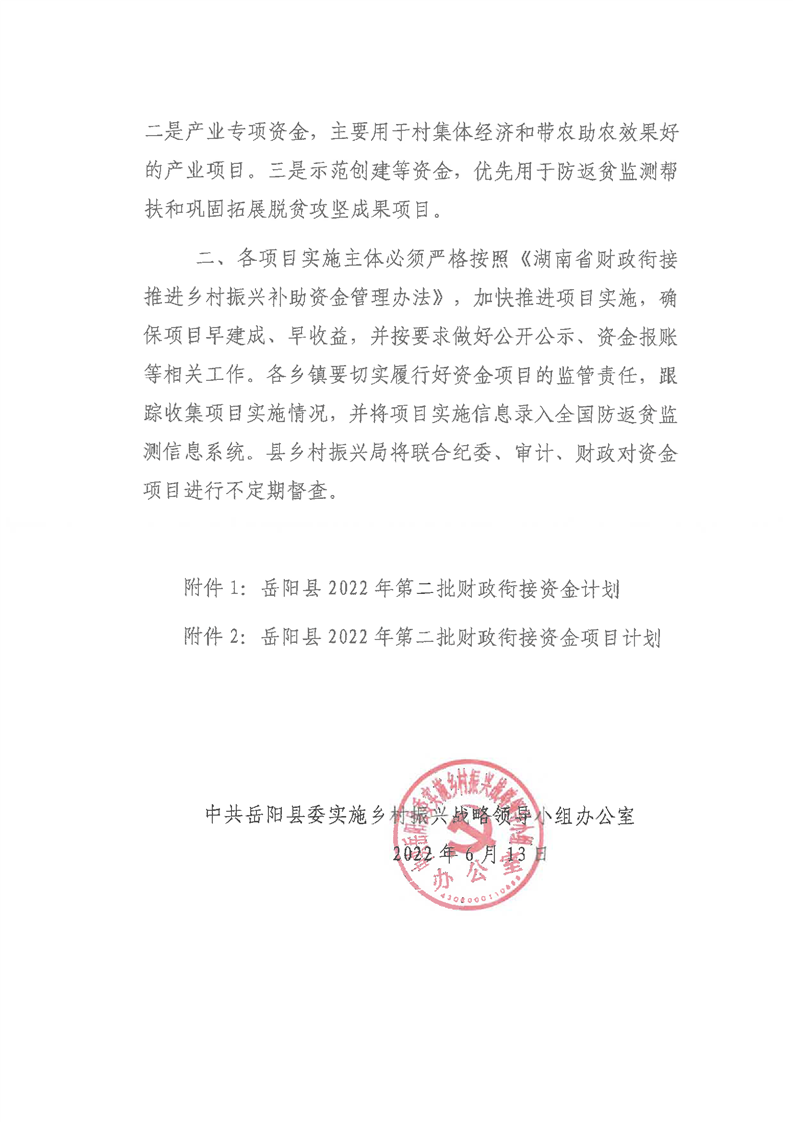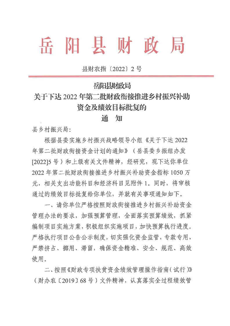 嶽陽縣財政局2022年關於下達第二批財政銜接推進鄉村振興資金及績效目標批複公開公示