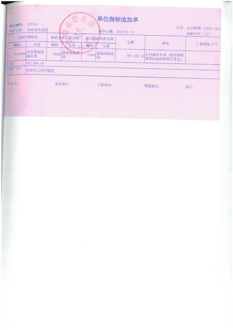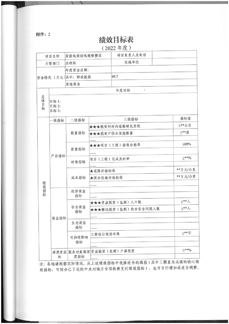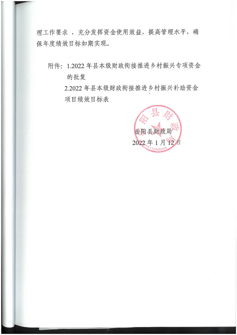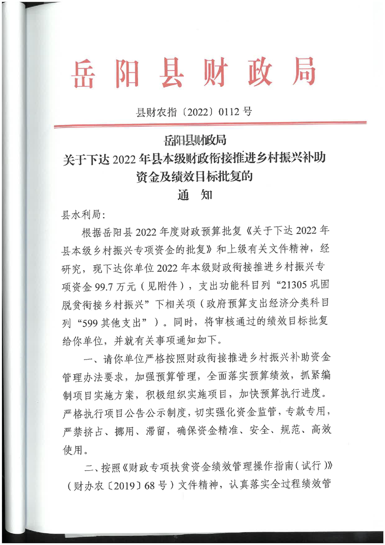 嶽陽縣財政局關於下達2022年縣本級財政銜接推進鄉村振興補助資金及績效目標批複(水利局99.7)公開公示