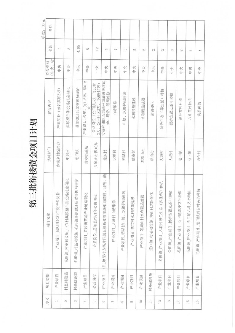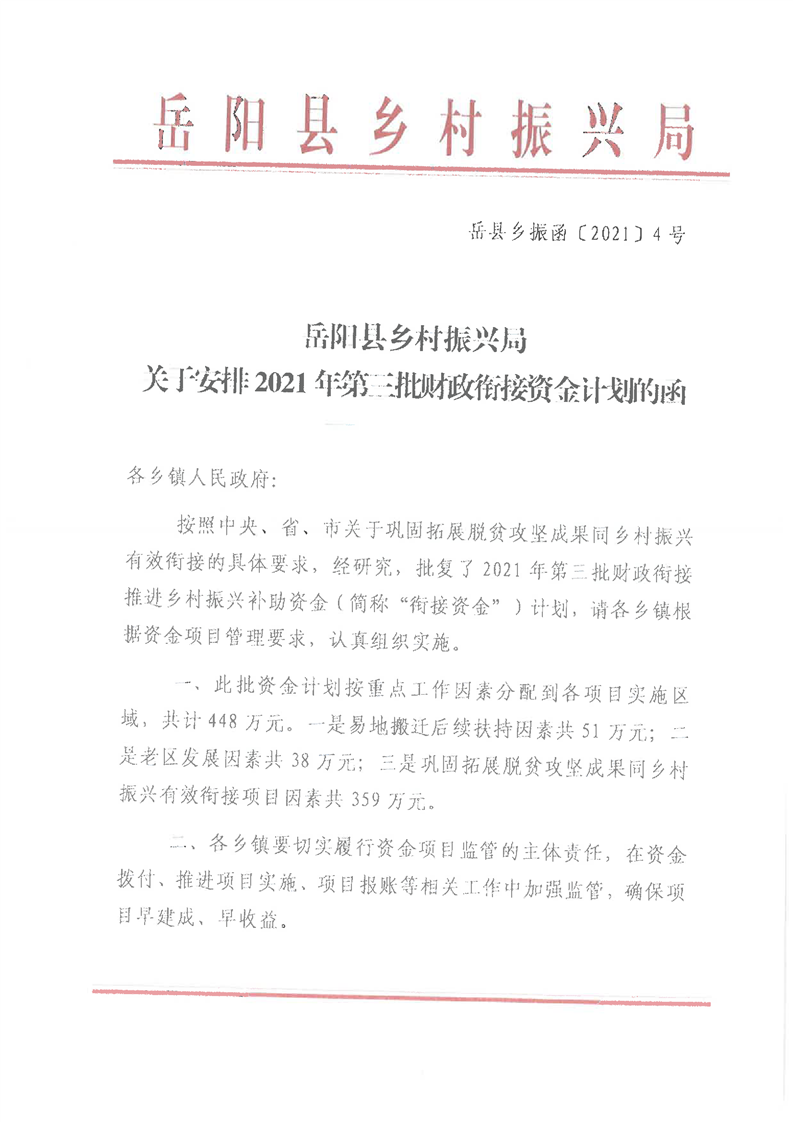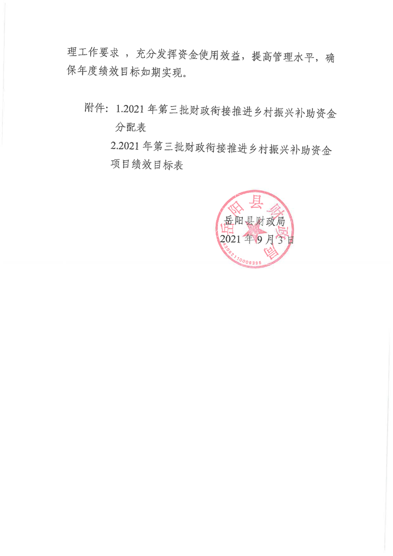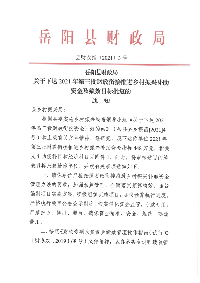 嶽陽縣財政局2021年關於下達第三批財政銜接推進鄉村振興資金及績效目標批複公開公示