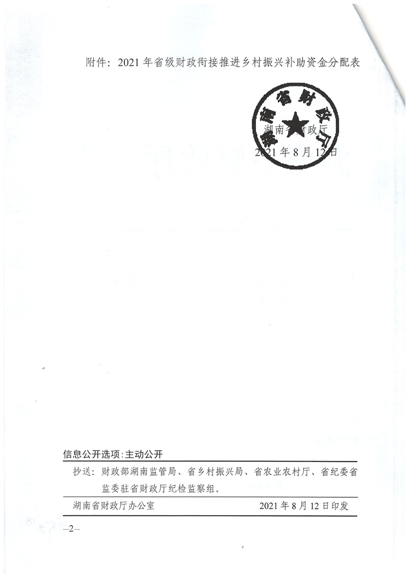 湖南省財政廳下達2021年省級財政銜接推進鄉村振興補助資金公開公示(二)