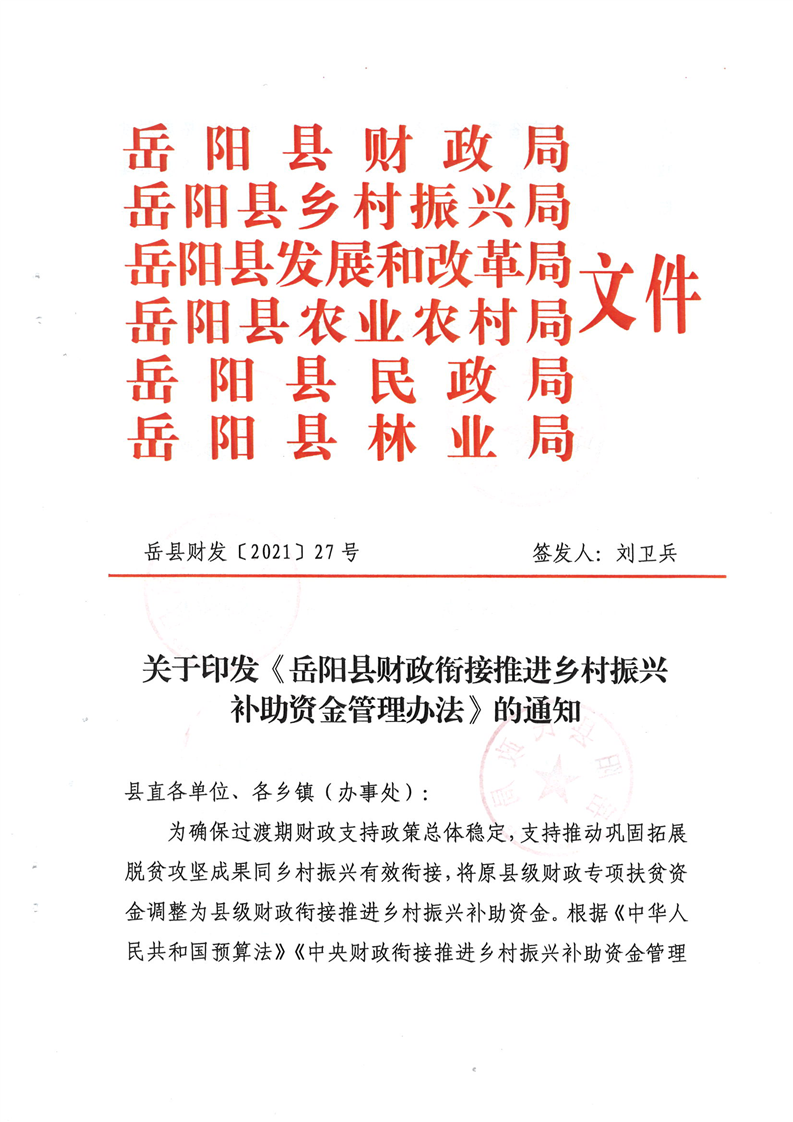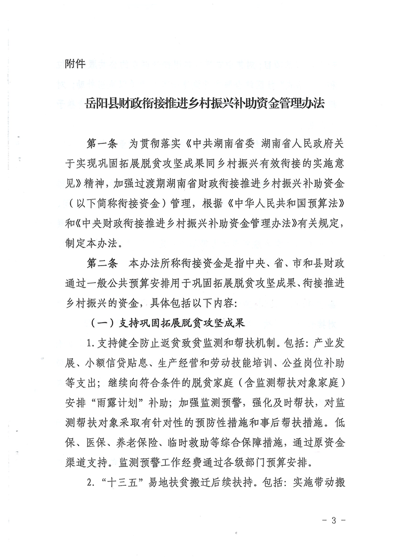 關於印發《嶽陽縣財政銜接推進鄉村振興補助資金管理辦法》的通知公開公示