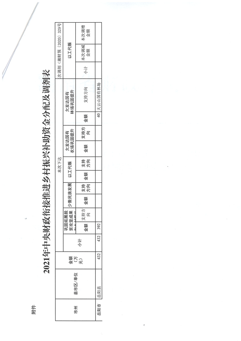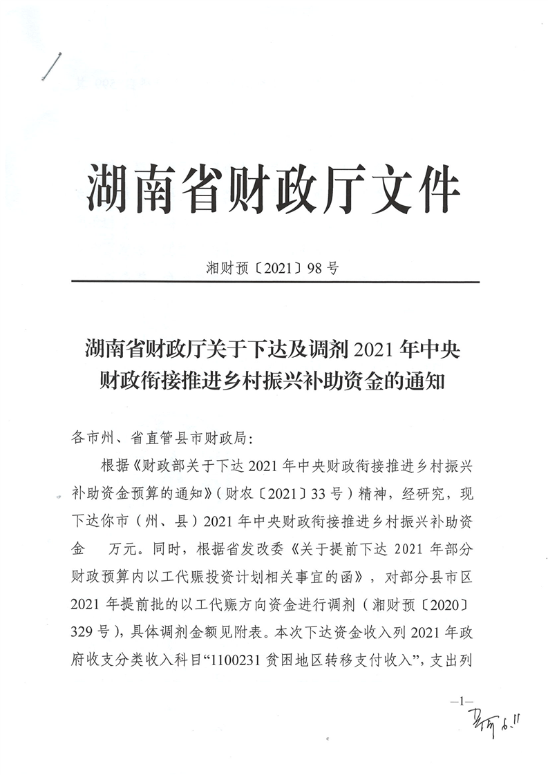 湖南省財政廳下達及調劑2021年中央財政銜接推進鄉村振興補助資金公開公示