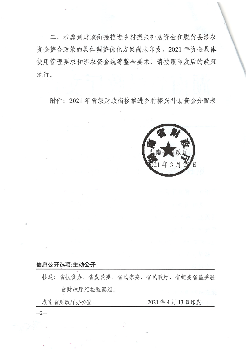 湖南省財政廳下達2021年省級財政銜接推進鄉村振興補助資金公開公示