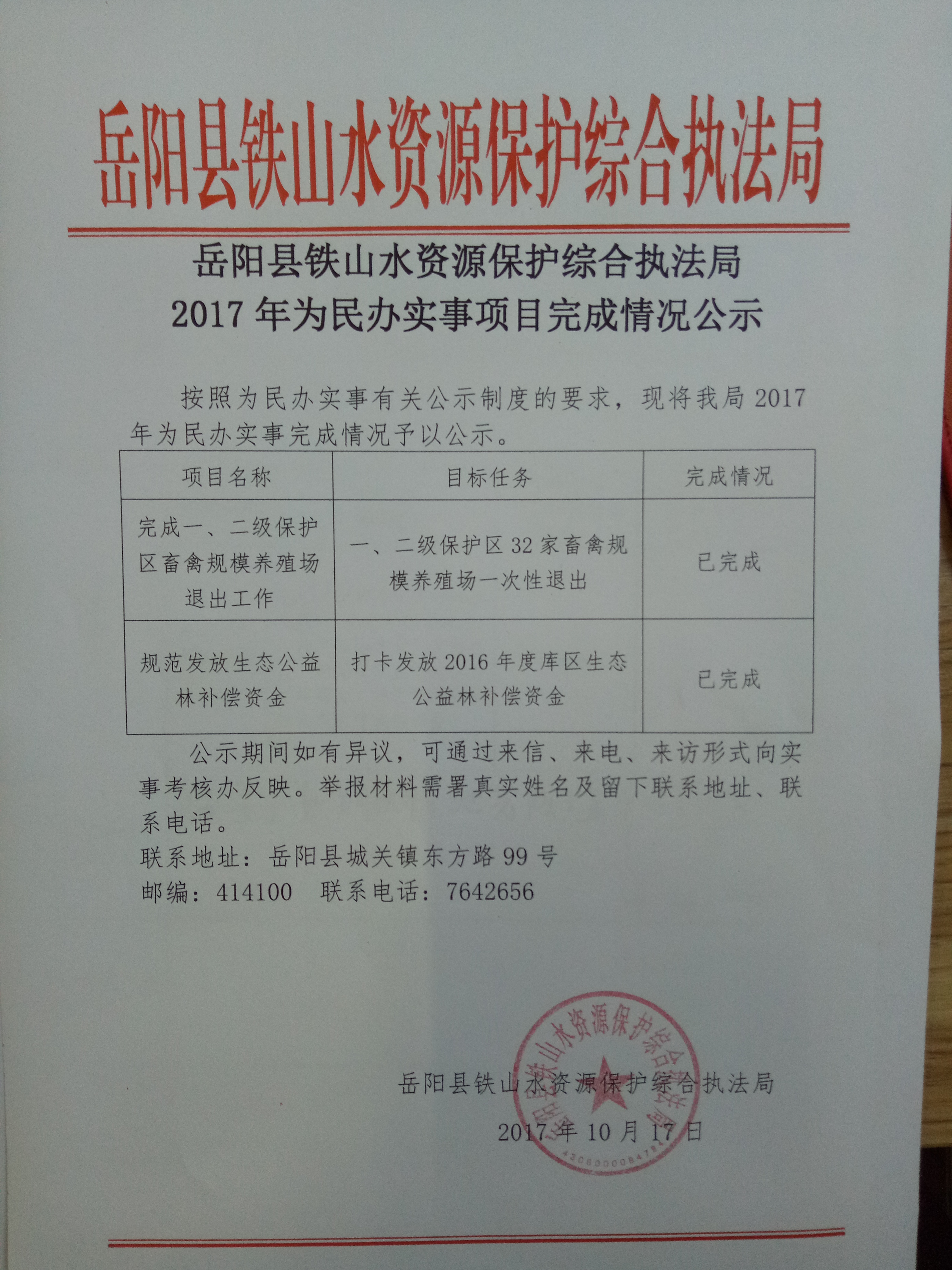 2017年民生實事鐵山水資源保護完成情況公示