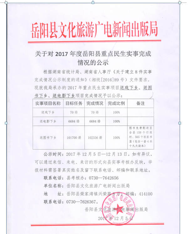 關於對2017年度嶽陽縣重點民生實事(文化惠民工程)完成情況的公示