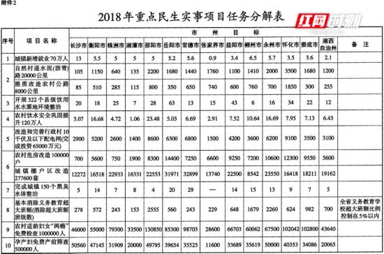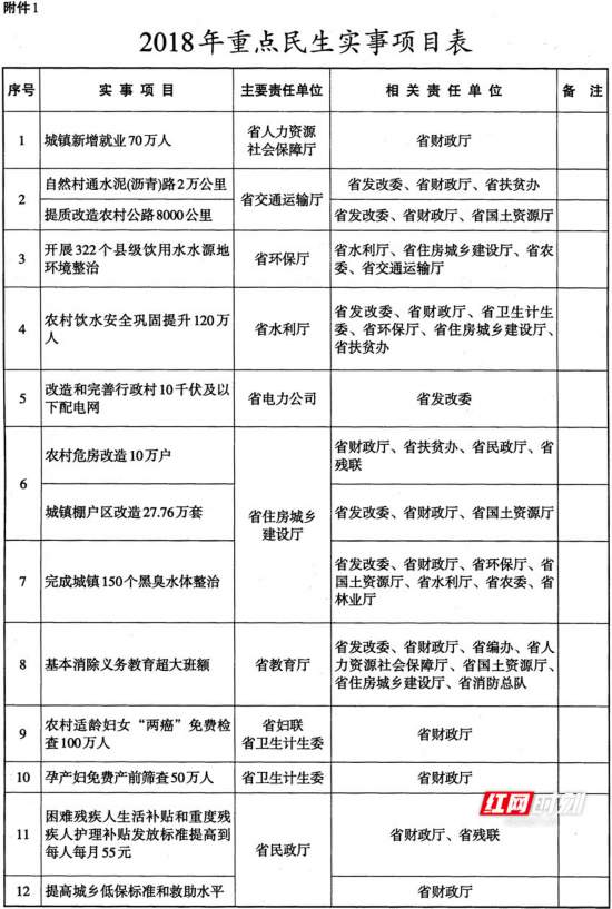 日前,湖南省委辦公廳、省政府辦公廳出台《2018 年重點民生實事項目實施意見》,明確2018 年全省共12 件重點民生實事。 實施意見要求,將12 件重點民生實事項目任務落實到有關省直責任單位,具體考核驗收標準由省績效辦、省統計局會同有關單位製定。19 個省直責任單位完成指標任務的數據由省統計局評估認定,省績效辦組織核驗。 同時,對14 個市州人民政府的考核指標。由各項目主要責任單位結合實際,將任務分解到市州。市州人民政府完成指標任務的數據,分別由各項目主要責任單位初評後,報省統計局評估認定,省績效辦組織核驗。 省重點民生實事項目指標直接納入2018 年市州黨委、政府和省直有關部門績效評估指標體係。