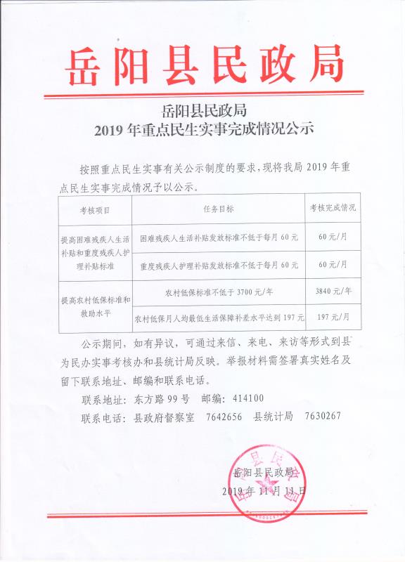 嶽陽縣民政局2019重點民生實事完成情況公示